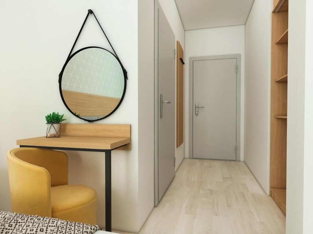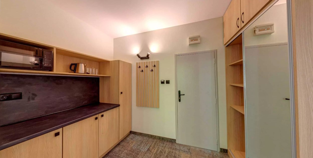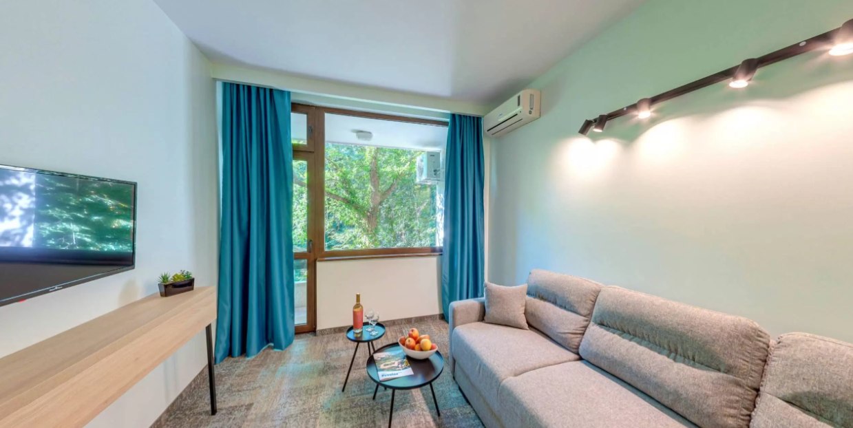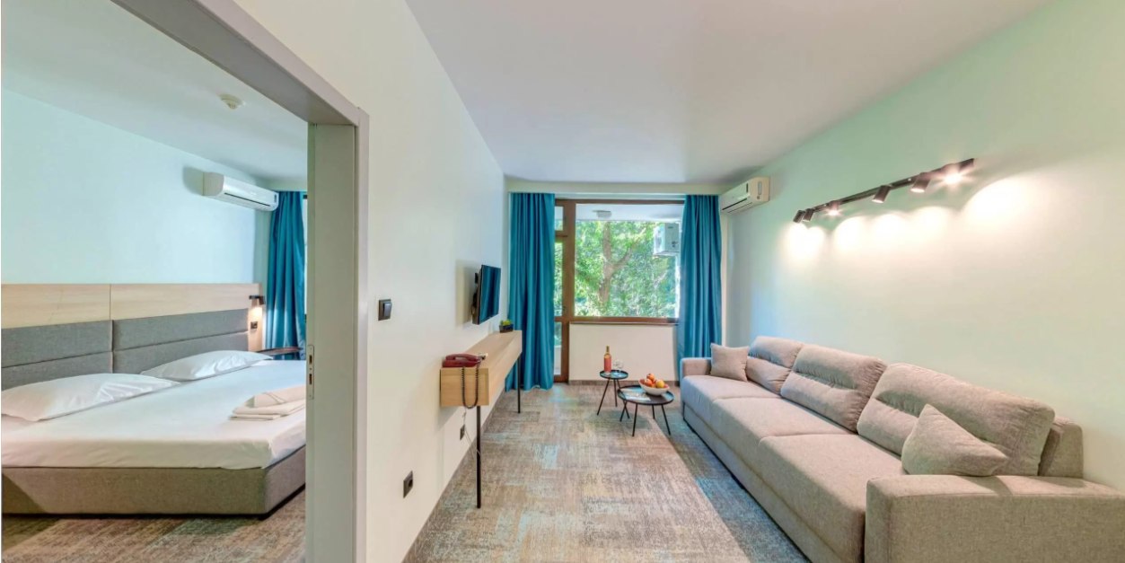 Має 2 комфортно мебльовані юмнати, розділені суміжними дверима. В одній з кімнат є двоспальне ложно (2м/2м), в інший розкладний диван Дитяче ліжечко можна замовити заздалегідь. На балконі є стіл з чотирма стільцями та гарний краєвид. Кімнати стандартно обладнані необхідними зручностями для літнього відпочинку біля моря. Гостям надається безкоштовне відвідування фітнес центру. В номері є окремо місце для валіз