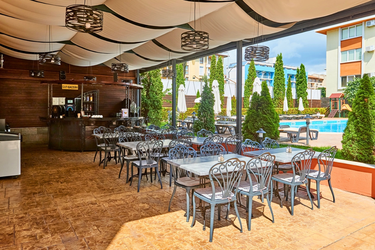 з 11:00 до 15:00 – сендвічі, піца тощо. • з 15:00 до 17:00 – печиво, тістечка, млинці, десерти та морозиво. • з 10:00 до 23:00 – чай, кава та молоко. • необмежена кількість місцевих напоїв (алкогольних та безалкогольних) з 11:00 до 23:00 у барі "All Inclusive bar"