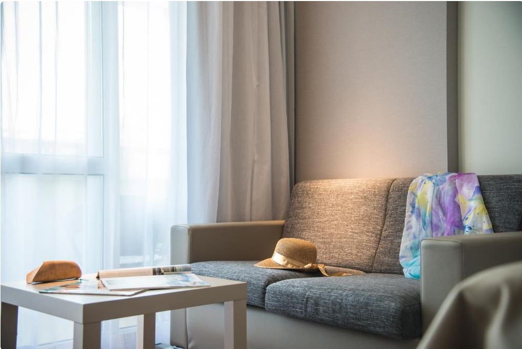 Номер складається з 2 спалень з двоспальними ліжками і невеликого коридору, невелика зона відпочинку, мінікухня, балкон, краєвид на курорт.