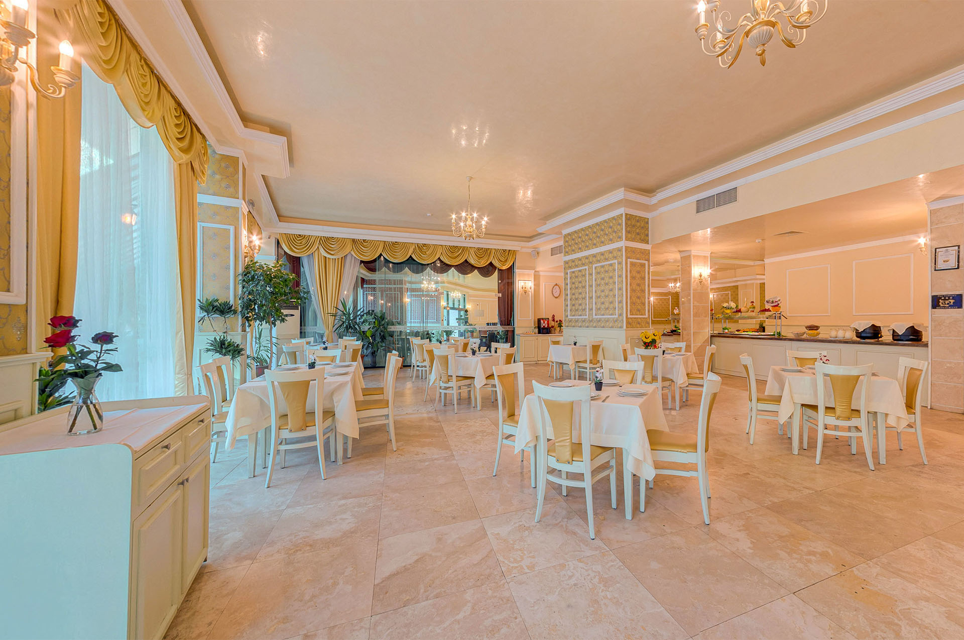 Ресторан «Мена Палас» розташований на першому поверсі та оформлений у класичному стилі. Він має критий обідній зал на 140 місць та велику терасу ще на 140 місць.