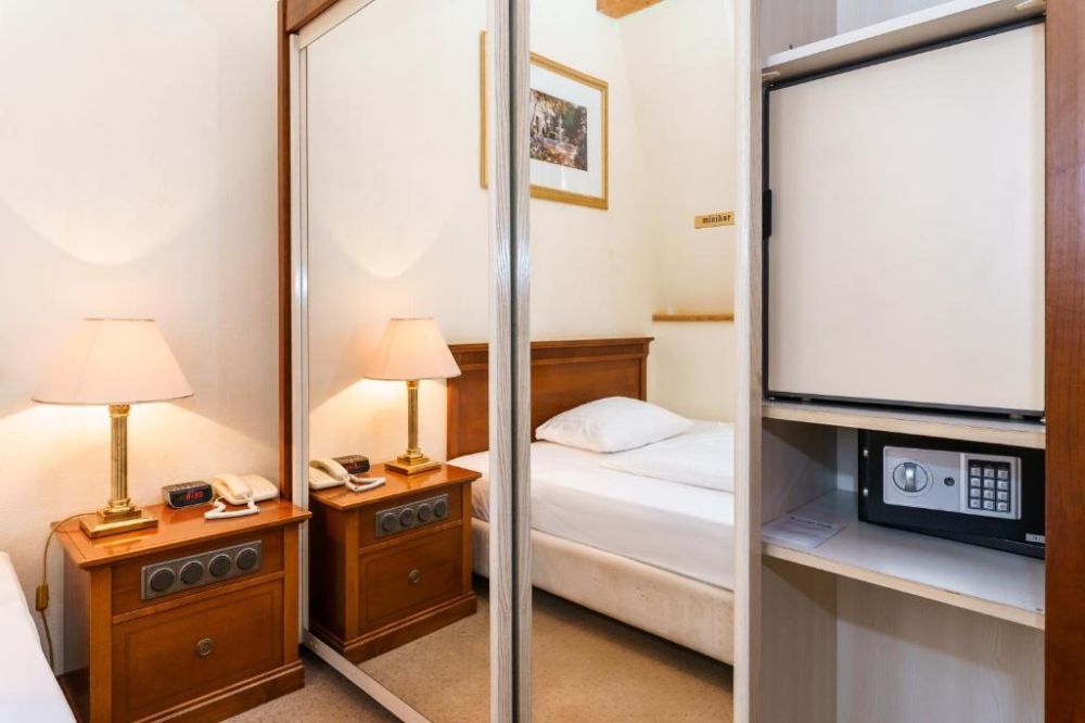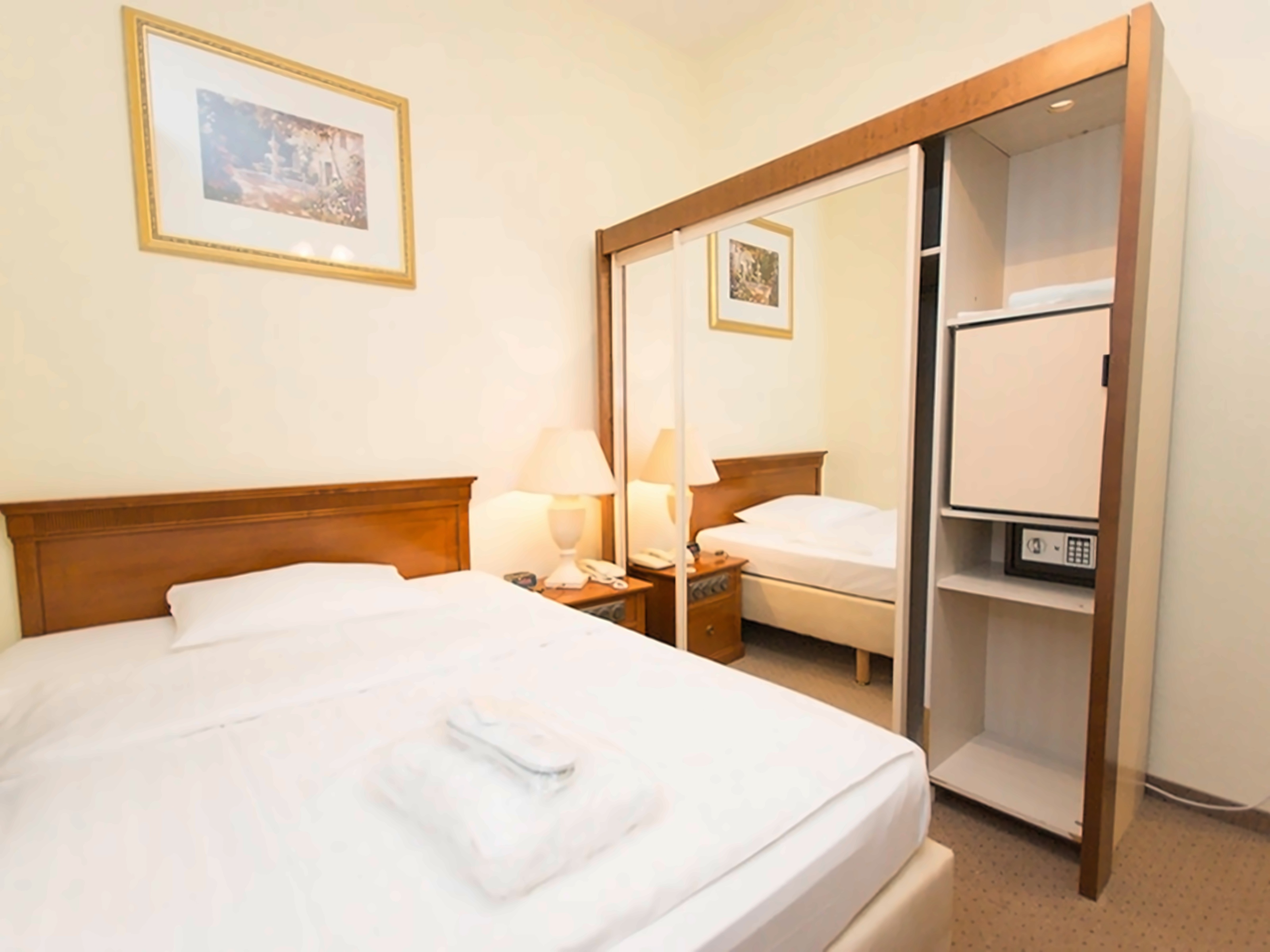 Тихі номери з  видом на внутрішній двір. Номер обладнаний одномісним ліжком, шафою-купе, письмовим столом та ванною кімнатою з душовою кабіною. Queen size ліжко 150x200.