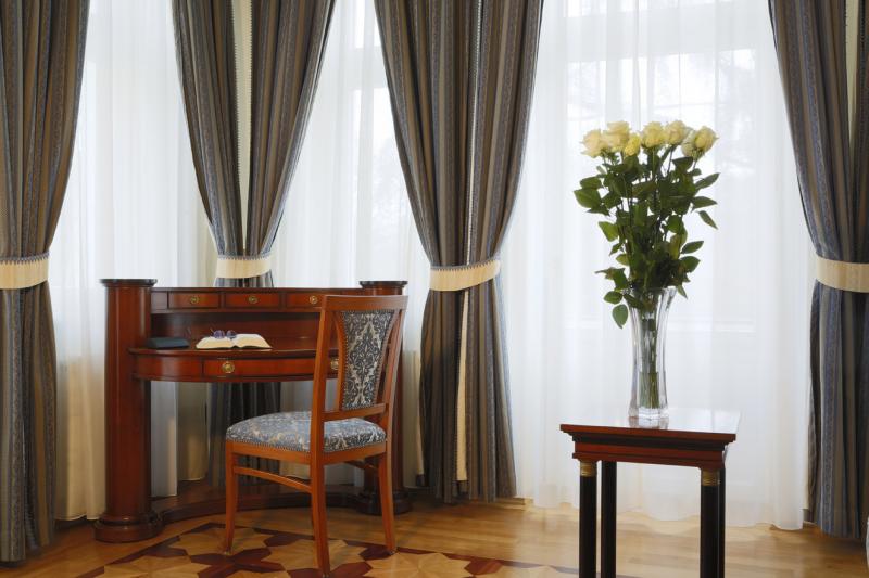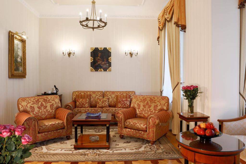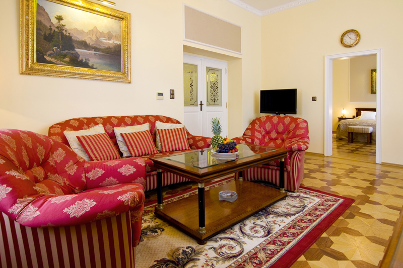 Трикімнатний номер з вітальнею і двома спальнями. У день приїзду тарілка з фруктами і пляшка шампанського.
