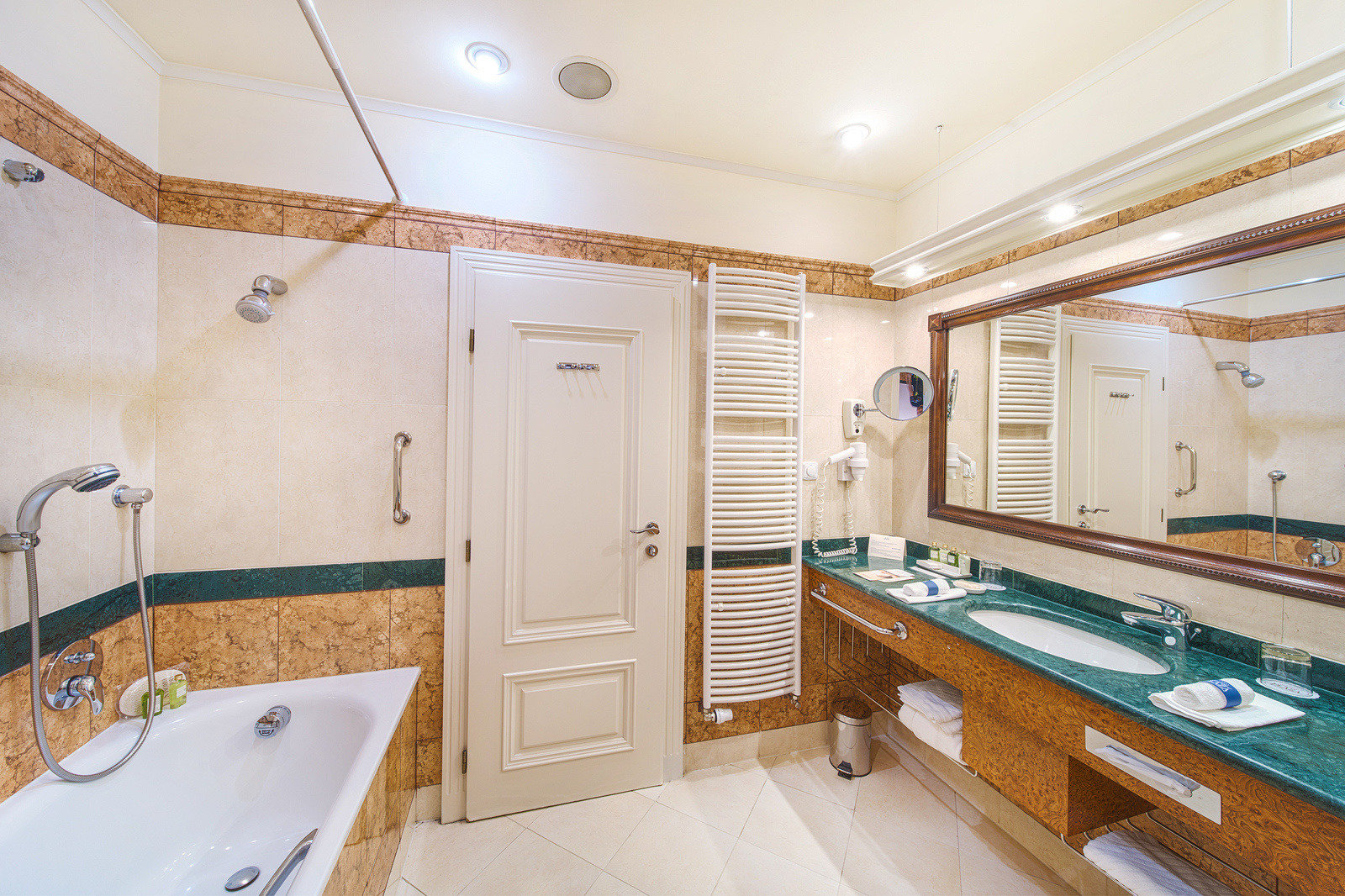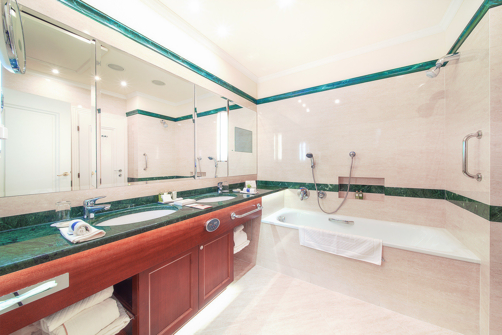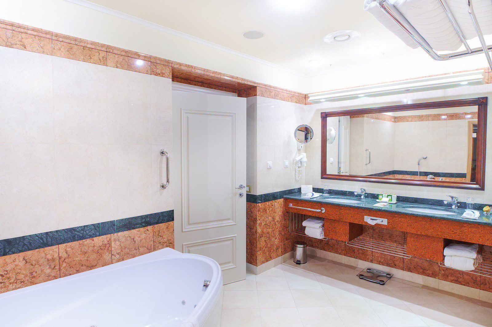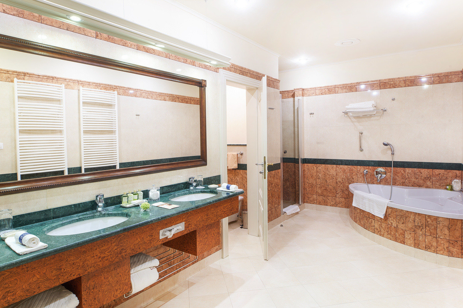 Можливо з'єднати з Exclusive Suite. Окрема гостьова вбиральня. Ванна кімната із джакузі. Також у номері є сауна.