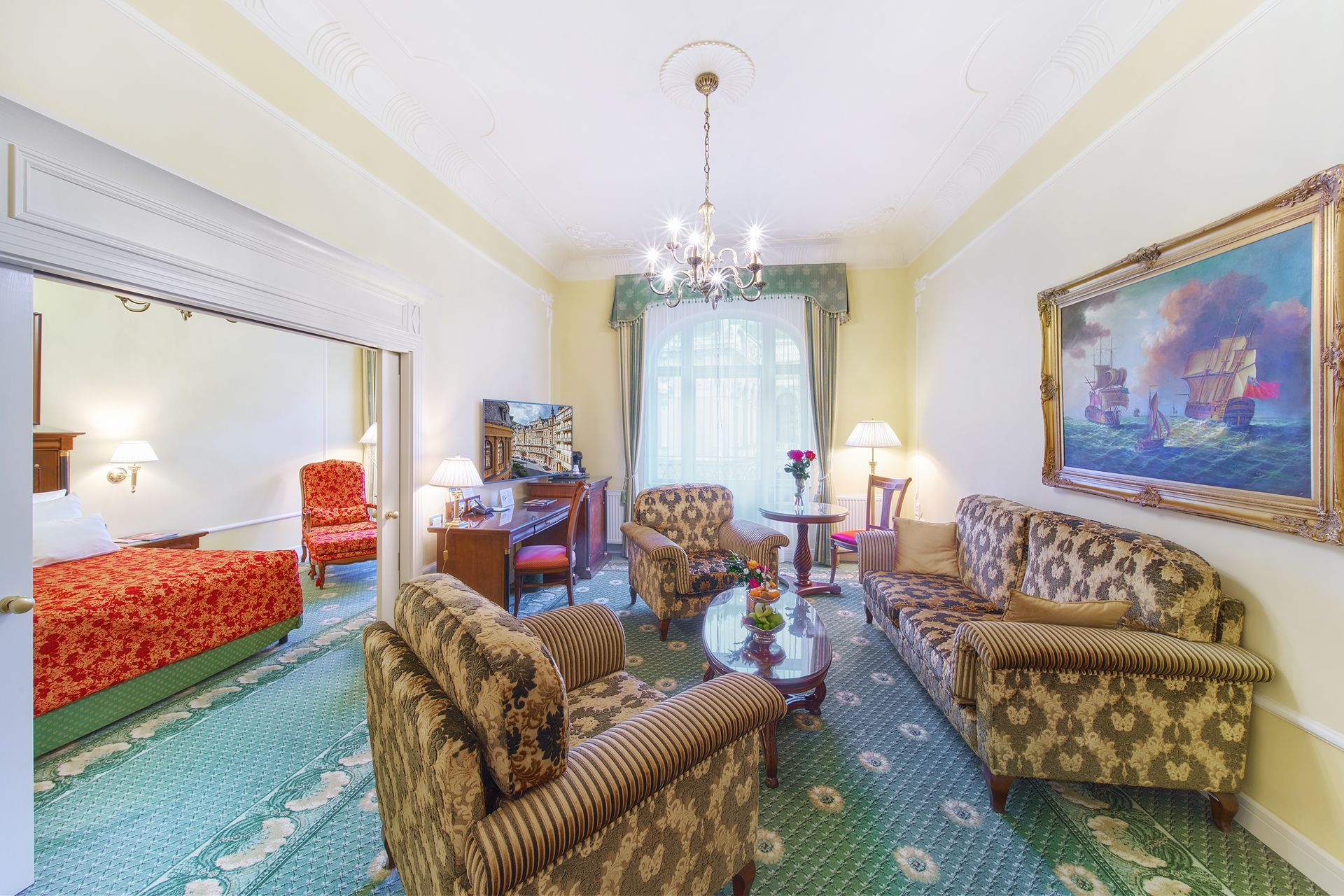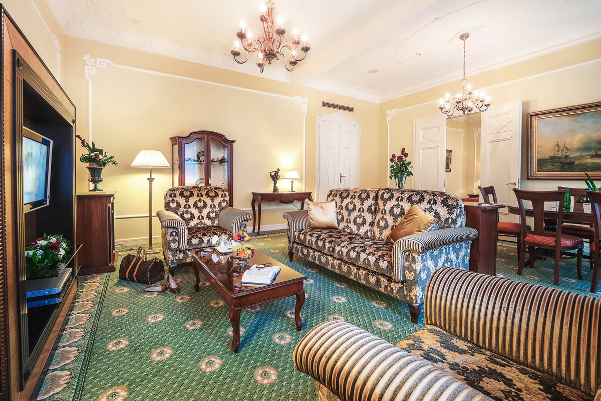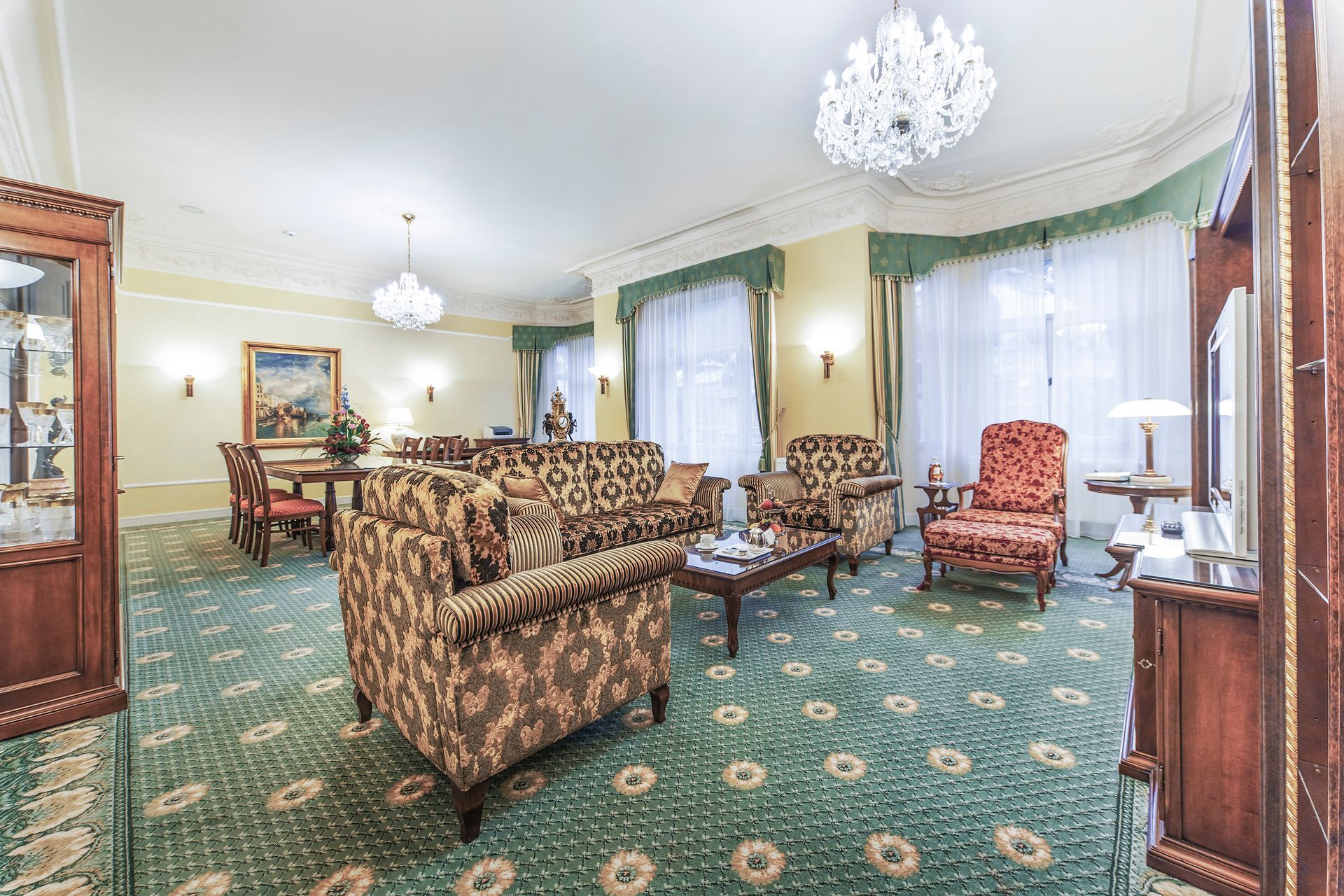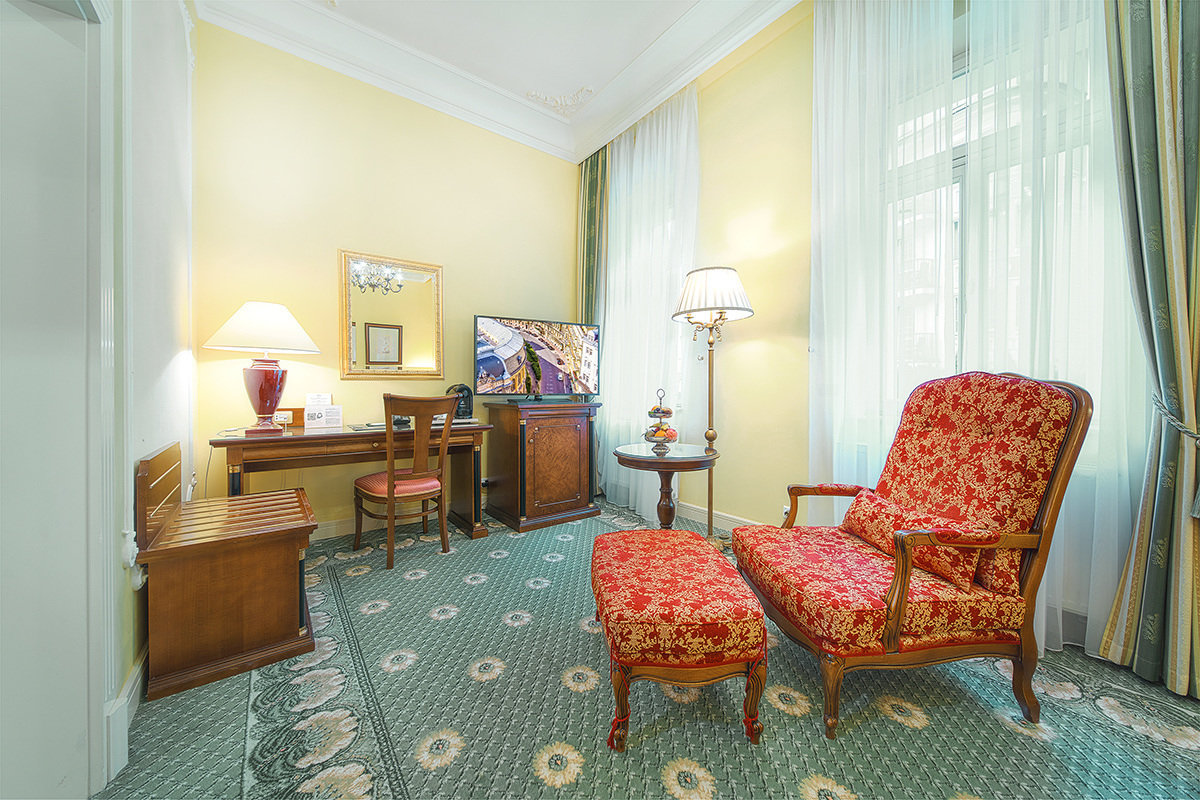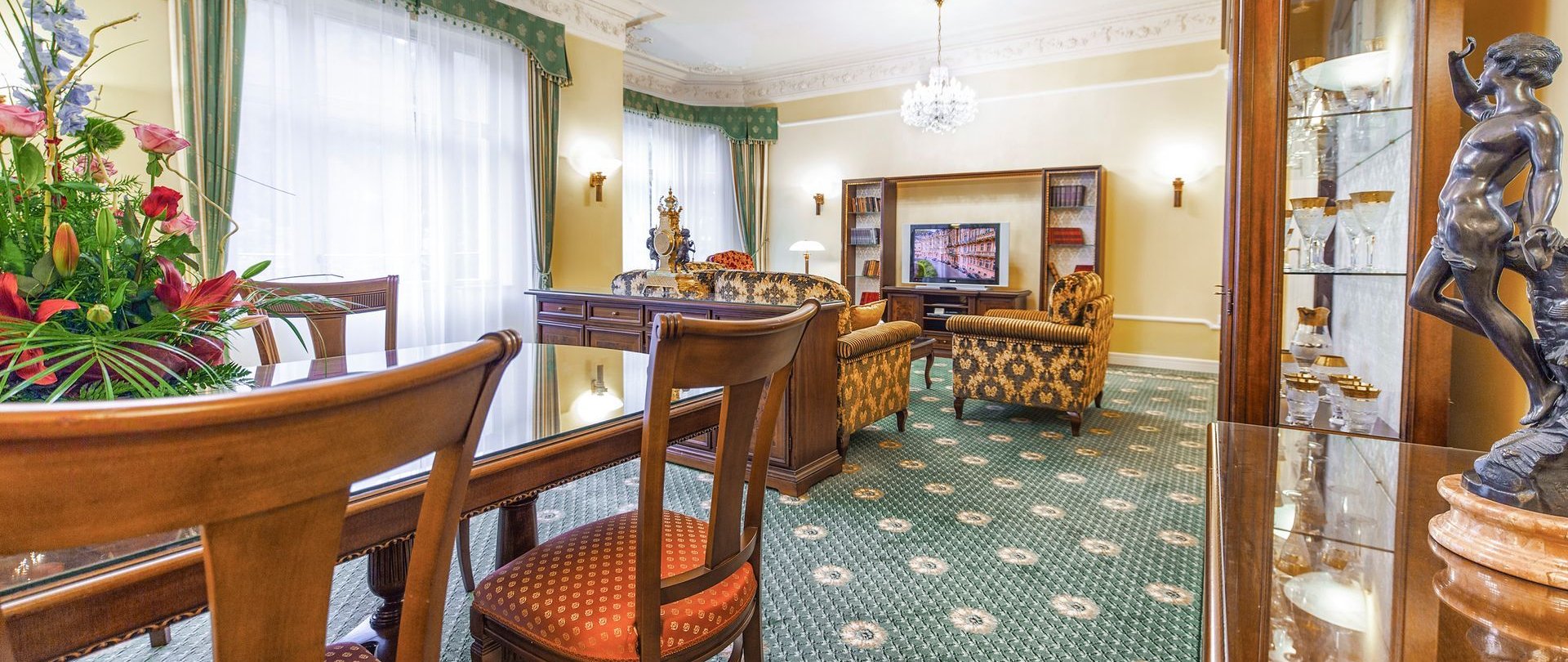 Цей номер з гарним декором на стелі та видом на тиху курортну зону міста розташований у будівлі "Old House" (історична частина 18-го століття). Вітальня з обіднім столом та кришталевими виробами фірми Moser.Можливо з'єднати з двомісним номером Supreme. крема гостьова вітальня.