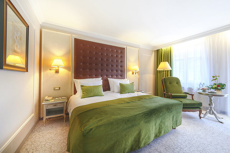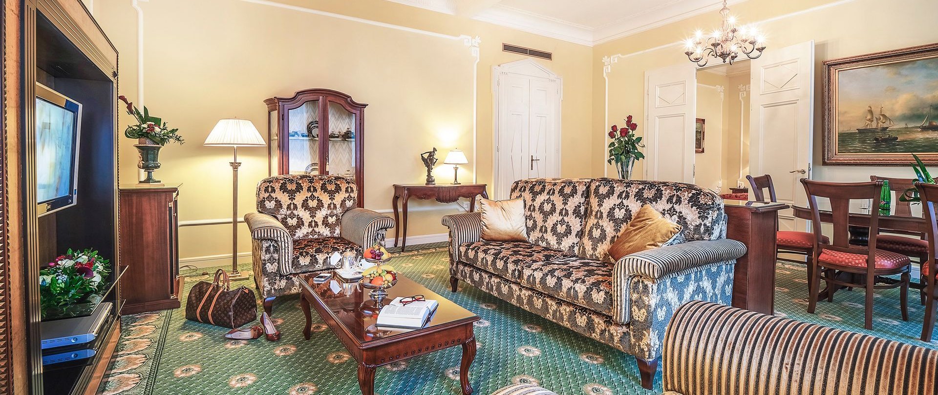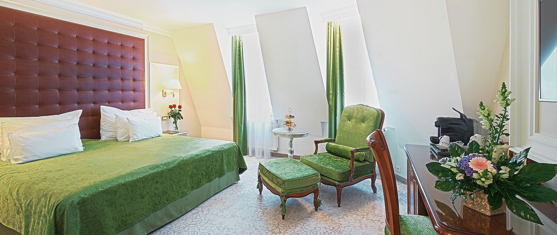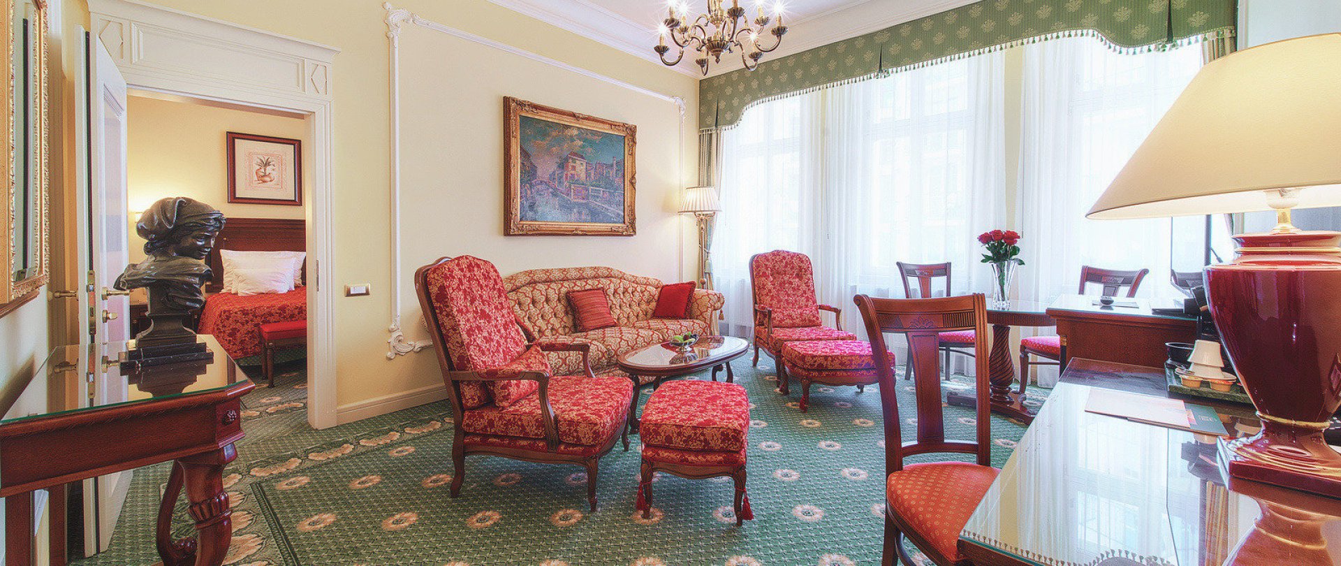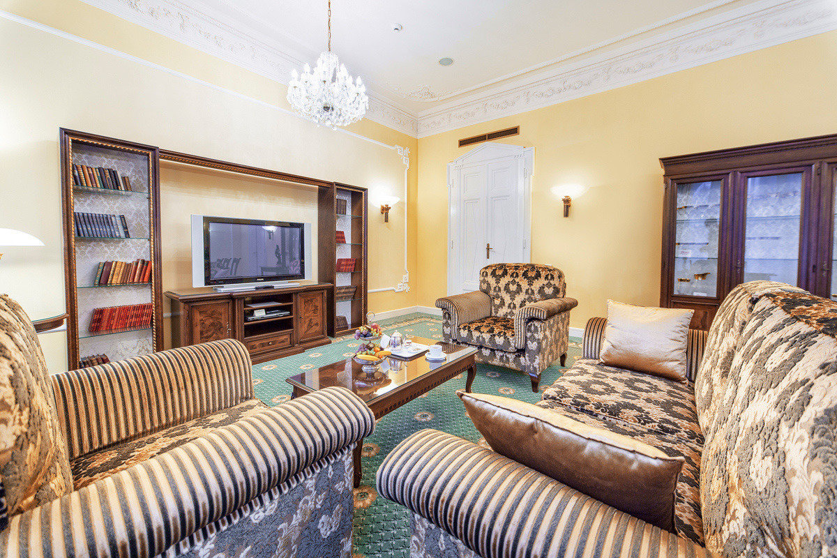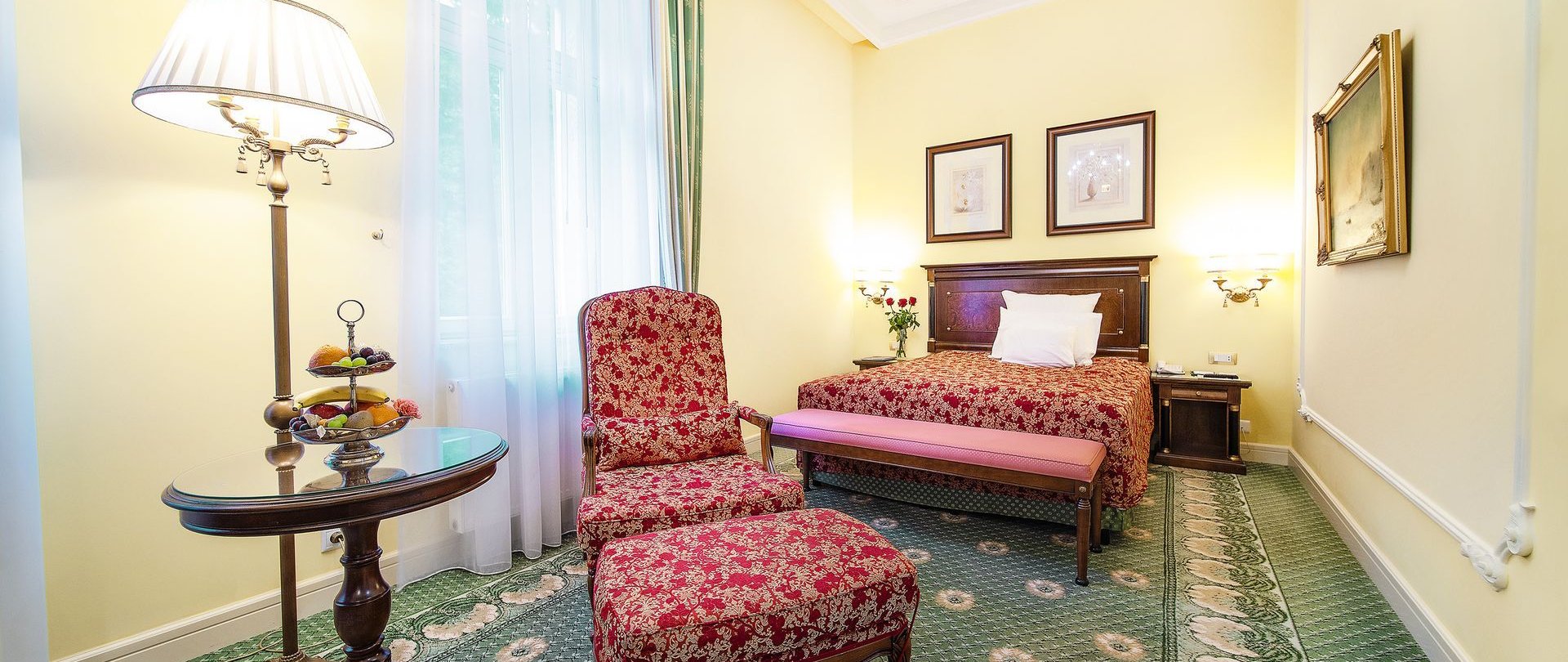 Цей номер з гарним декором на стелі та видом на тиху курортну зону міста розташований у будівлі "Old House" (історична частина 18-го століття). Вітальня з обіднім столом та кришталевими виробами фірми Moser.Можливо з'єднати з двомісним номером Supreme. крема гостьова вітальня.