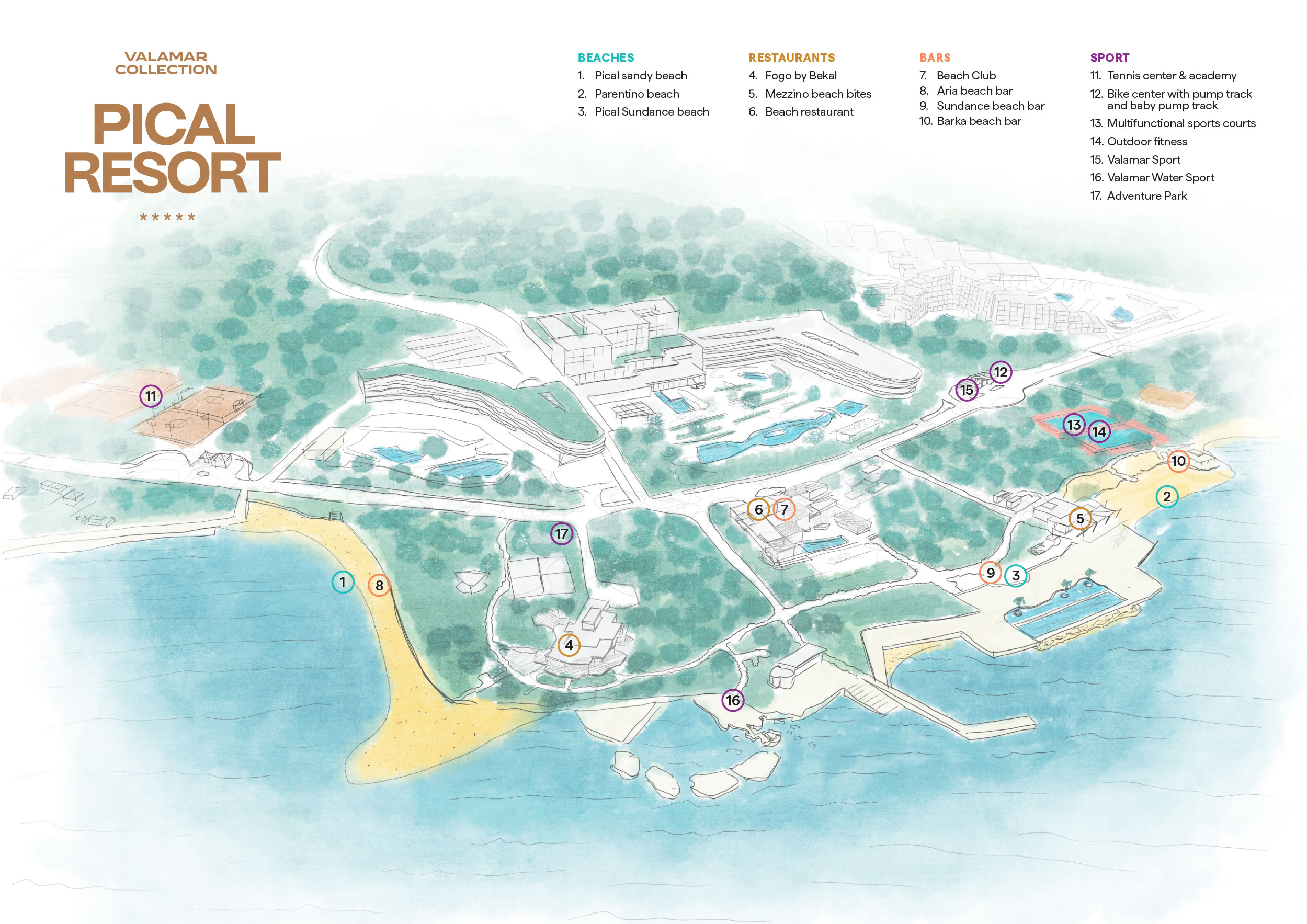 Parentino beach - гальковий, трав'янистий та асфальтований з затінений природним пологом пишних сосен у відведених місцях. 200 м від курорту Pical. Є піщана зона для засмаги. Підходить для сімей з дітьми, пар, активних гостей, гостей з інвалідністю.