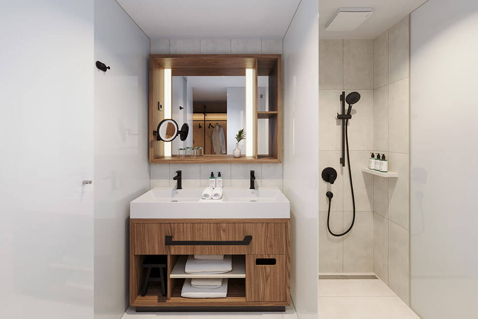 Ванна кімната з душем та двома умивальниками, окрема туалетна зона.