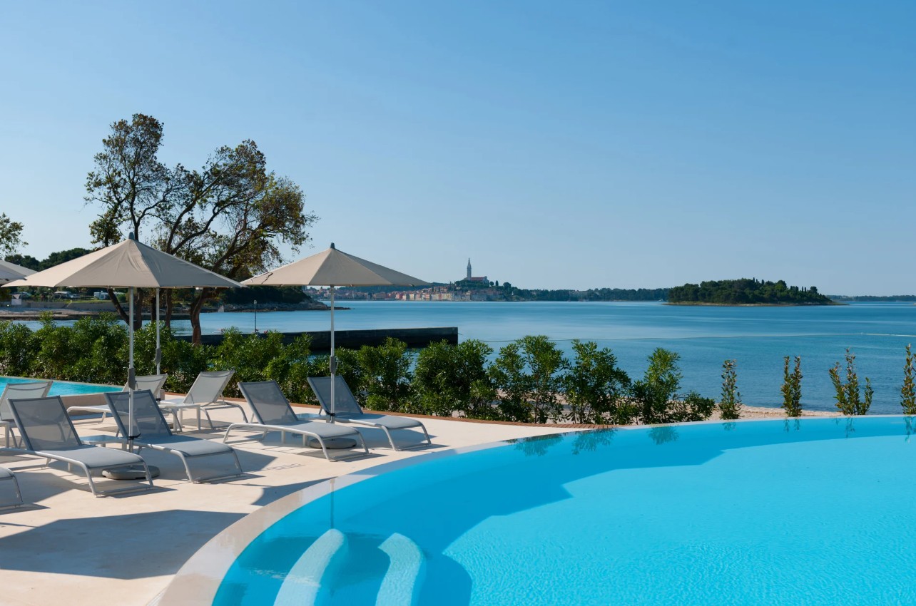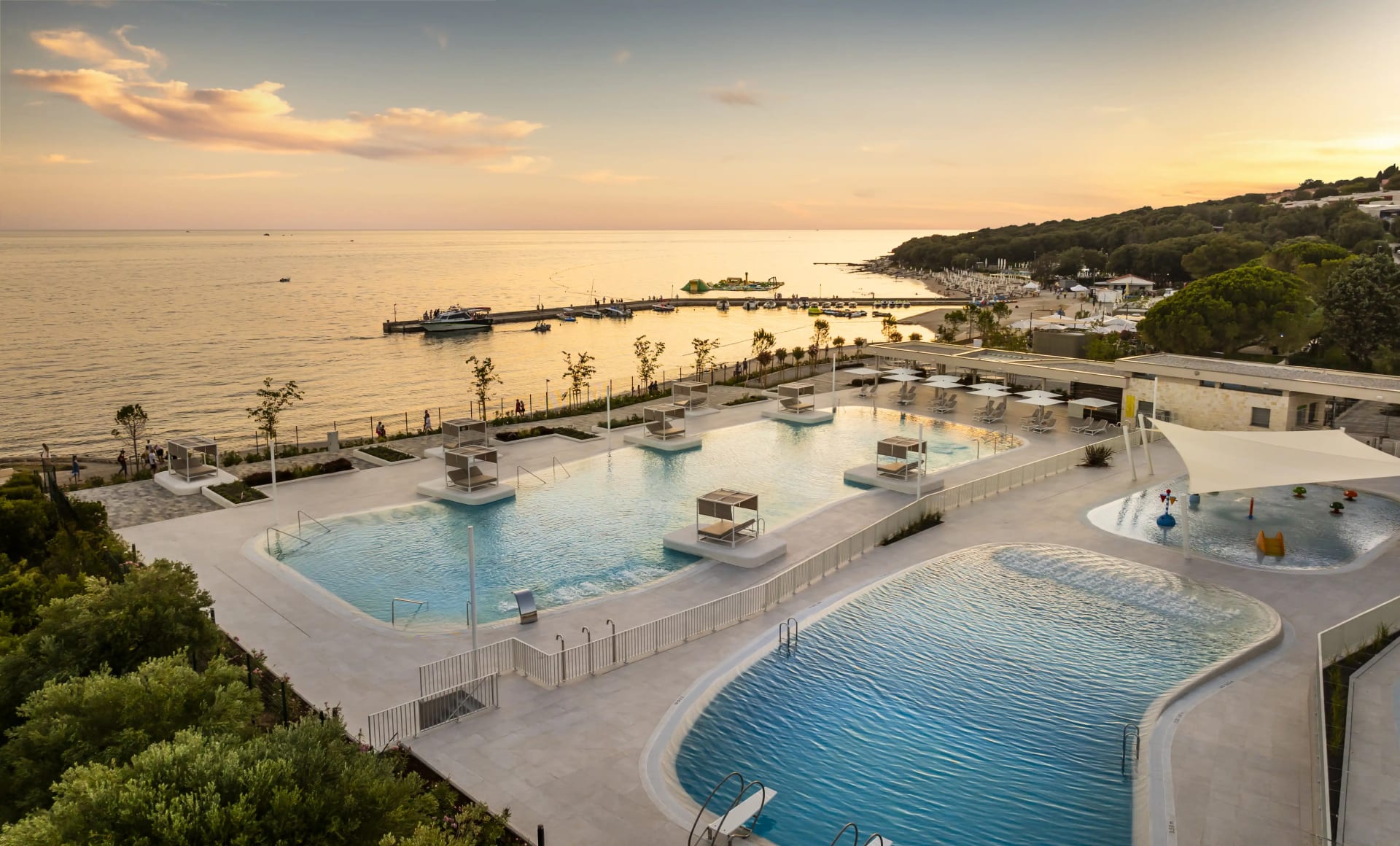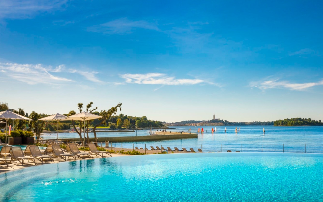 Насолоджуйтесь відпочинком біля трьох прекрасних відкритих басейнів з морською водою, ідеально розташованих прямо біля пляжу з незабутнім видом на місто Ровінь.