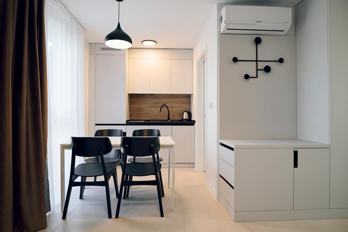 Елегантна та функціональна кухня містить холодильник з морозильною камерою, посудомийну машину, духовку, електричну плиту, чайник та основне кухонне обладнання, пральну машину в окремій зоні та їдальню, розраховану на 4 особи.