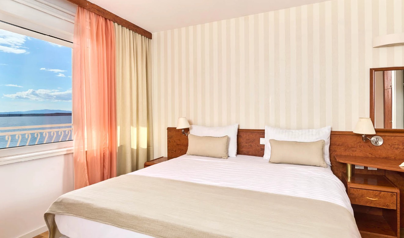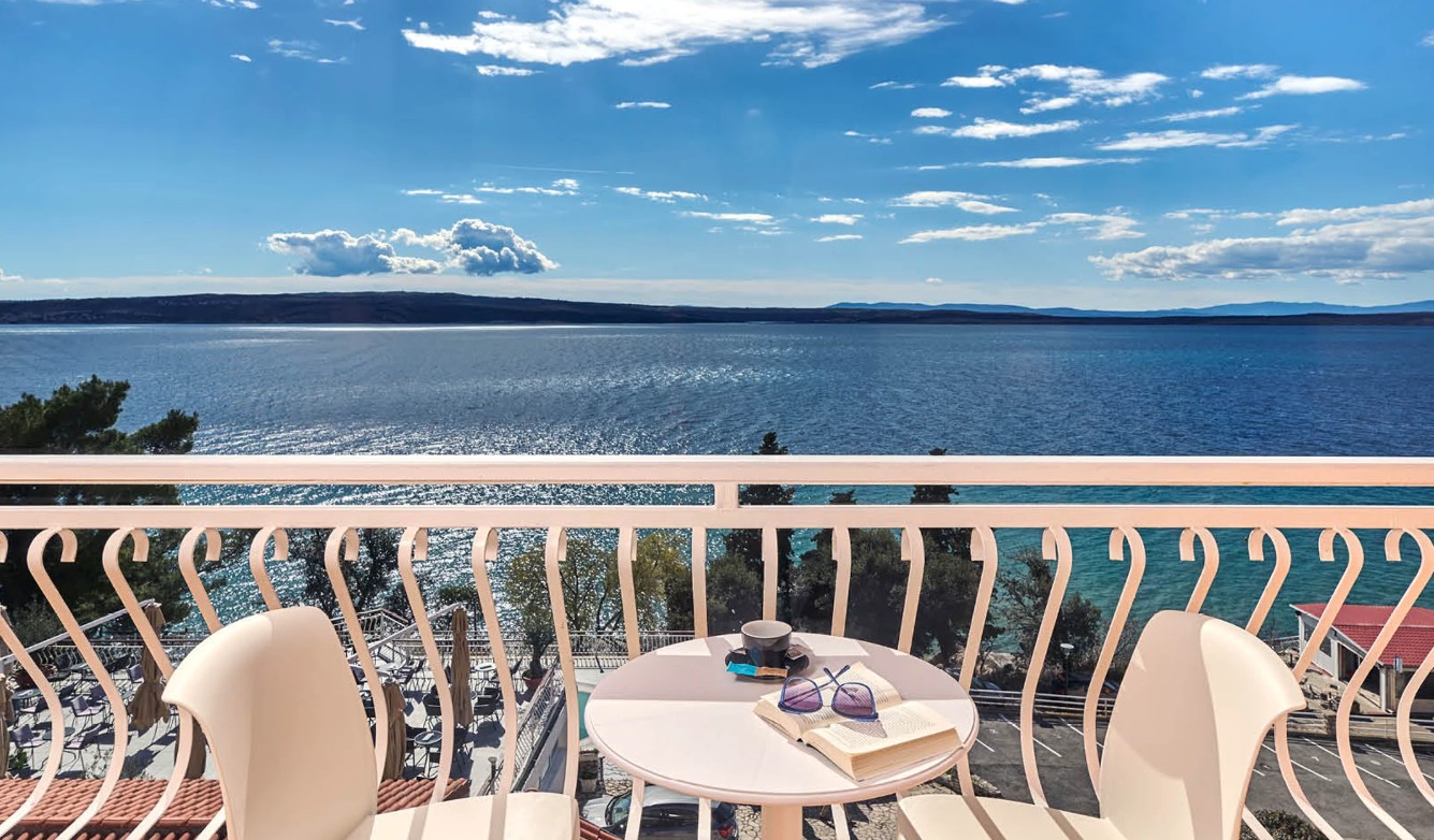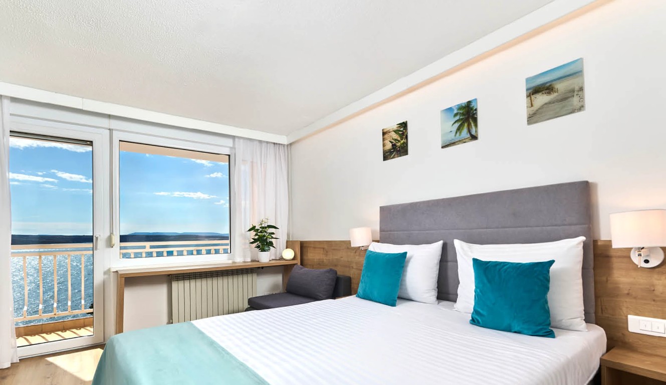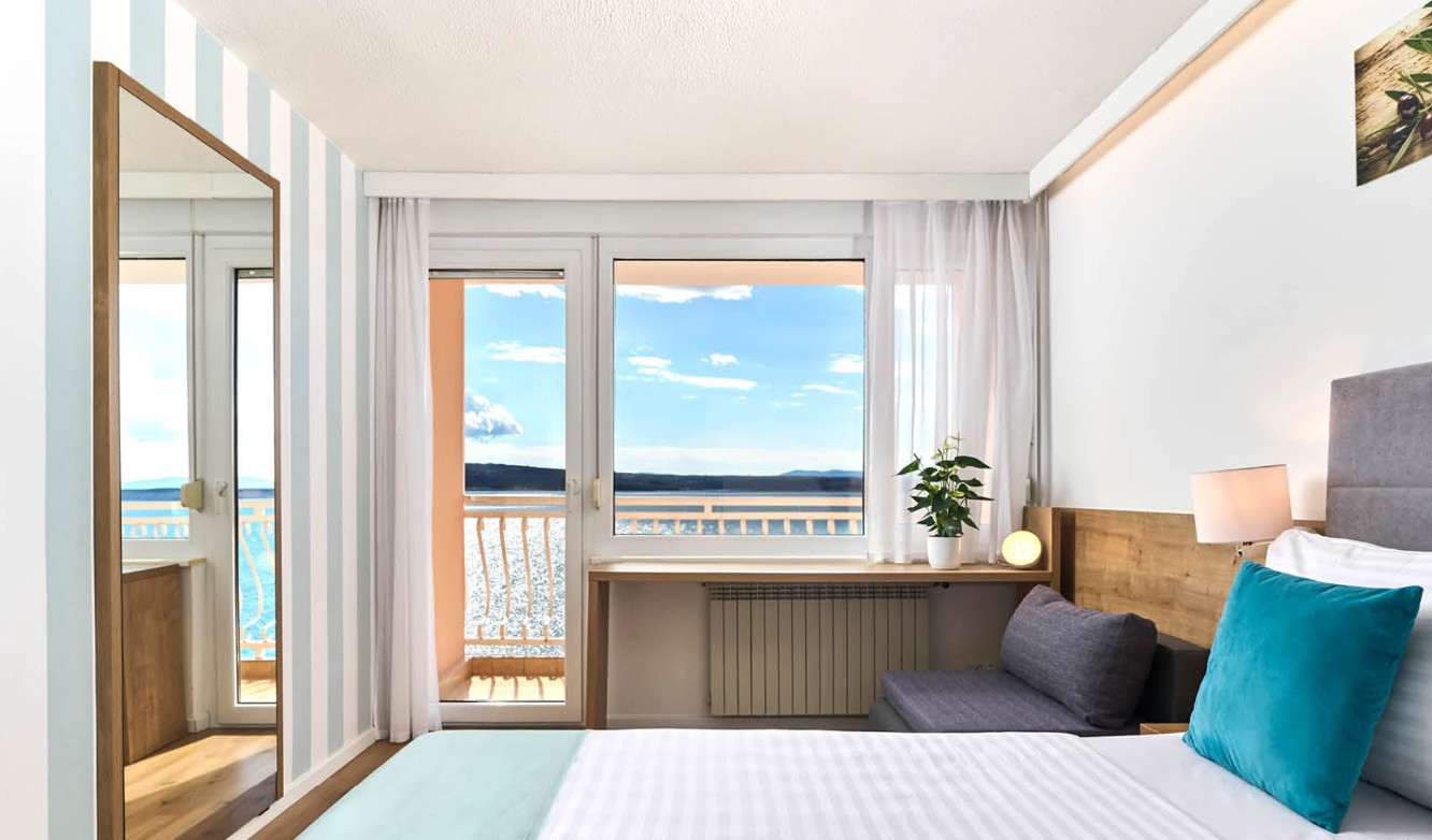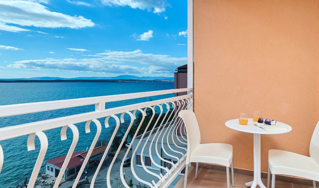 Відремонтований номер, балкон, вид на море, два односпальні ліжка/двоспальне ліжко, додаткове ліжко (80x190 см), ванна кімната з душем.