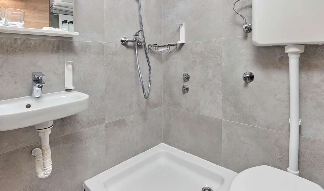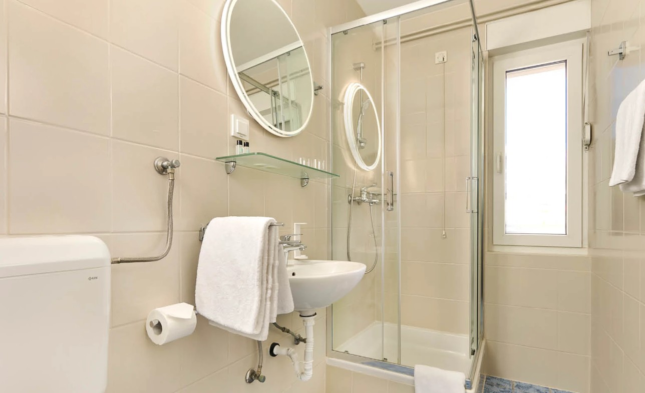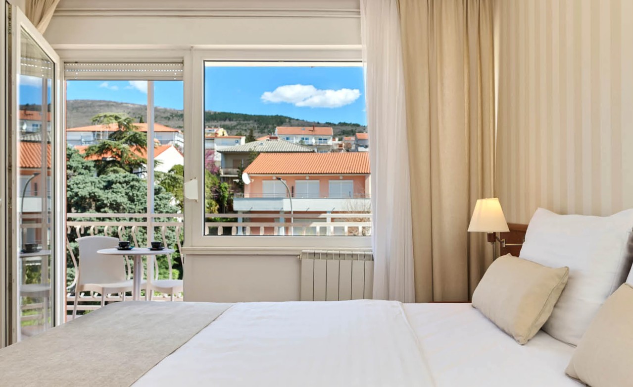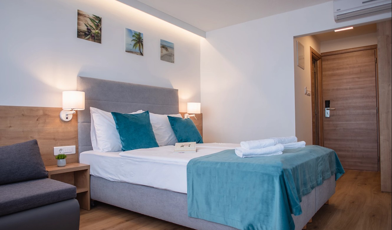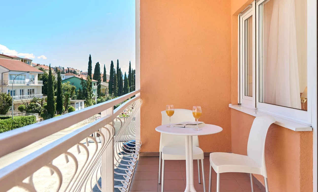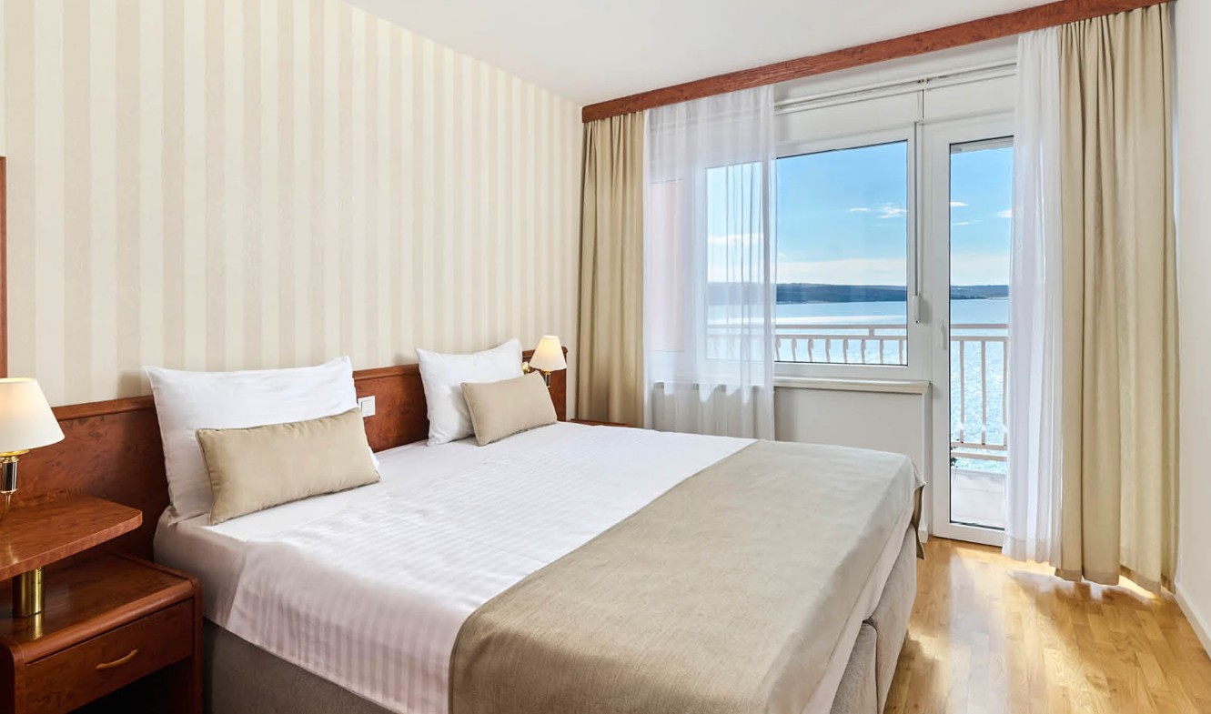 Відремонтований номер, балкон, вид на море, два односпальні ліжка/двоспальне ліжко, додаткове ліжко (80x190 см), ванна кімната з душем.
