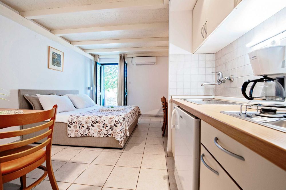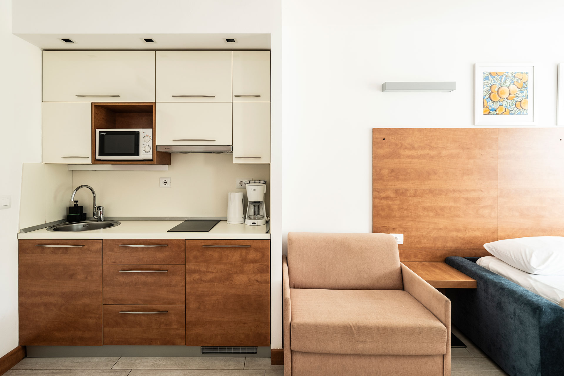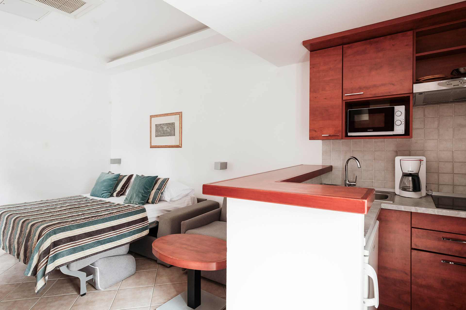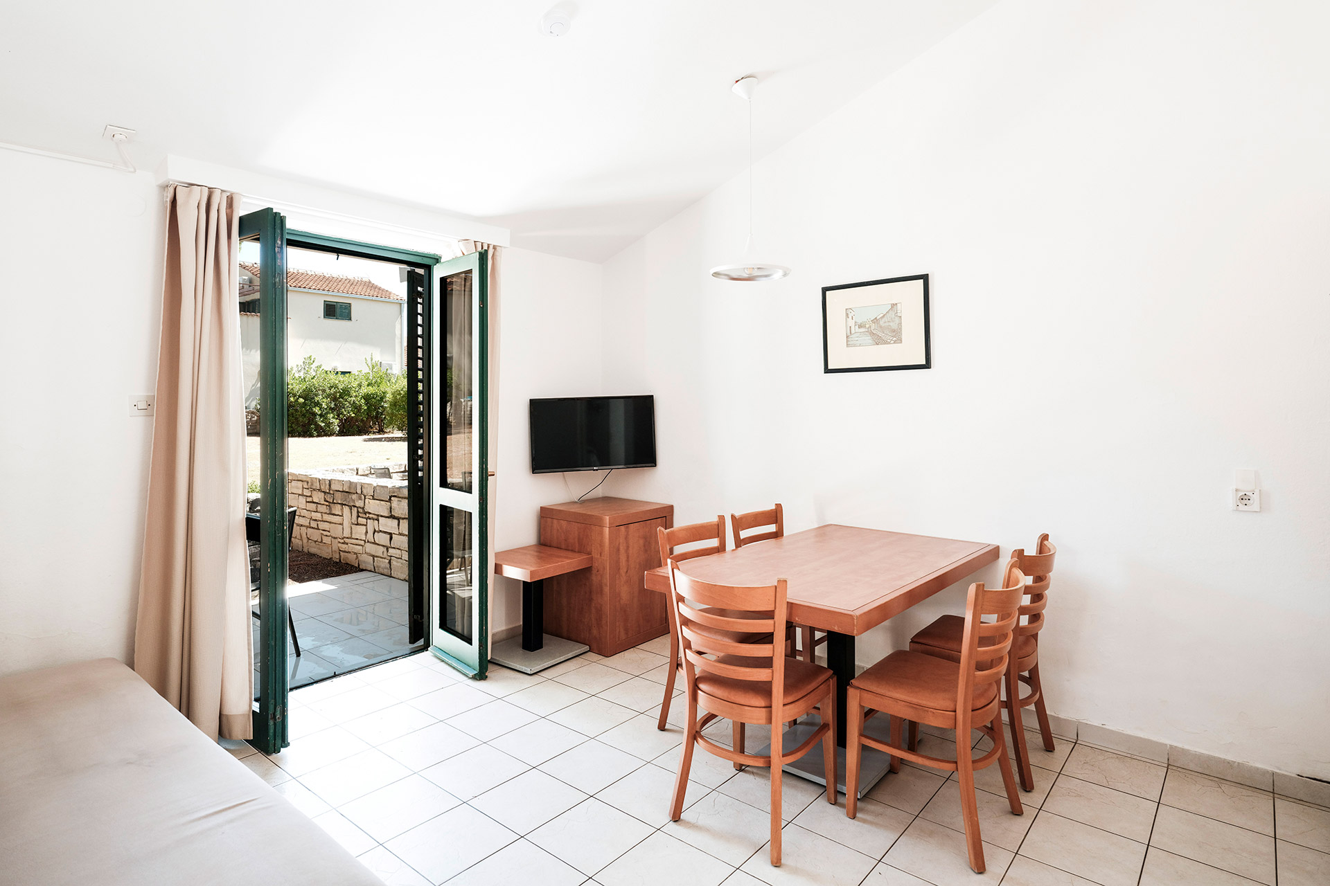 Вітальня зі спальною зоною для 2 осіб (розкладний диван). Обладнання: кавоварка, посуд, сушарка для сушіння одягу, вуличні меблі на терасі. Постільна білизна, рушники, необхідні засоби для прибирання.