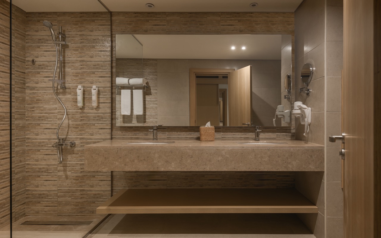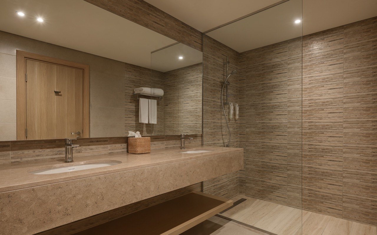 В номері спальня з двоспальним ліжком, вітальня з диваном, гардеробна, дві ванні кімнати з душевою та ванною, балкон або тераса.
