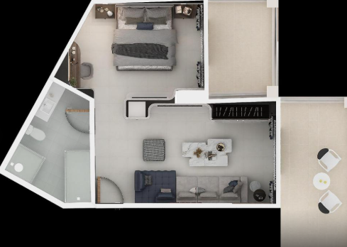 Обидва простори плавно з'єднуються з природою через приватний балкон, з якого відкривається прекрасний вид на сад, ідеальний для спокійного відпочинку.