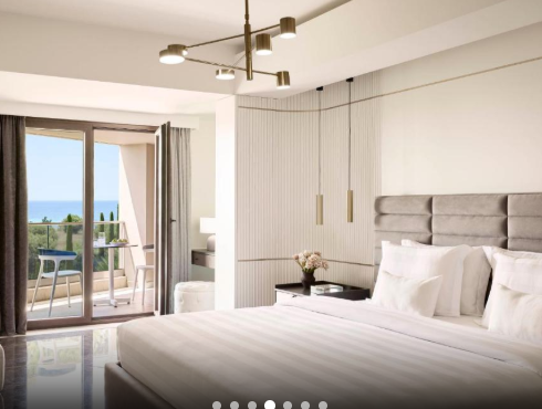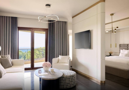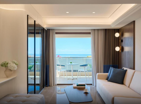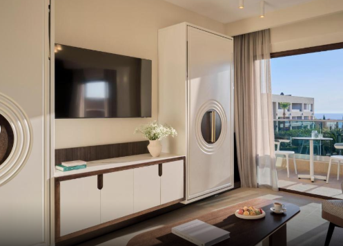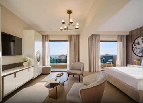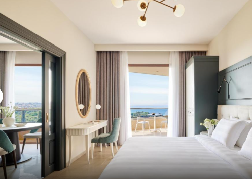 Основне ліжко – розкішне королівське, а у вітальні є два односпальні ліжка Murphy (90 x 200 см) з ортопедичними матрацами, які складаються в стіну для економії місця. Вікна від підлоги до стелі наповнюють простір природним світлом, а з приватних балконів відкривається розкішний ландшафтний сад або бічний вид на море. Оформлені в сучасному стилі з використанням високоякісних матеріалів, люкси створюють розслаблюючу атмосферу. Ванні кімнати обладнані гідромасажними ваннами та справжньою грецькою косметикою, що додає спа-атраційного шарму.