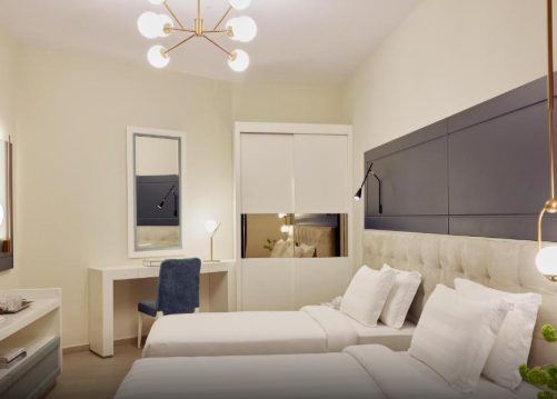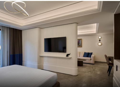 «Кассандра Люкс» – це вишукане доповнення до нашої колекції престижних люксів, розроблене для того, щоб запропонувати елегантність та комфорт на площі 46 м² у 5-зірковому готелі на Халкідіках, Греція. Цей люкс ідеально підходить для 2 дорослих, 1 дитини та немовляти.Він складається з вітальні та спальні, створюючи гармонійний та функціональний житловий простір.