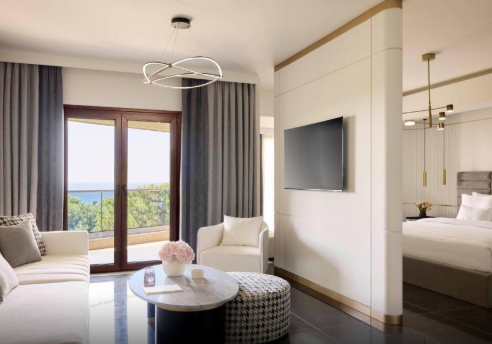 Люкс «Аріадна» пропонує вишукане поєднання елегантності та комфорту, що робить його ідеальним вибором для сімей або пар, які шукають спокійного відпочинку у 5-зірковому готелі на Халкідіках. Цей люкс площею 46 м² ідеально підходить для 2 дорослих, 1 дитини та немовляти, забезпечуючи достатньо простору та продумані зручності для незабутнього перебування.