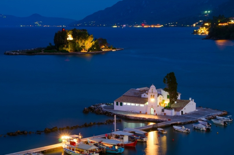 • Каноні — вид на Понтіконісі і Влахерена, поруч лагуна Халікіопулос (600 м).