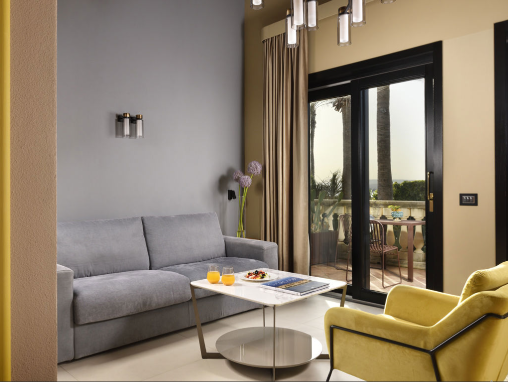 Просторий номер Olea Suite площею приблизно 105 кв.м. розділений на два рівні: перший поверх зі світлою вітальнею , завдяки скляним вікнам з видом на сад, ванною кімнатою та кутовим баром; другий поверх з великою вітальнею, обладнаною диваном-ліжком, головною спальнею та ванною кімнатою з душовою кабіною та ванною. Гвинтові сходи ведуть на невелику терасу з панорамним видом на море та острів Ортіджа . Зовні Olea Suite оточений пишним середземноморським садом площею близько 35 кв.м., в якому розташоване власне гідромасажне джакузі Jacuzzi®.