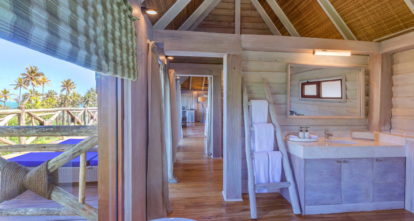 Розташований на пляжі Габі в дерев’яному бунгало площею 150 кв.м на березі моря, з терасою з видом на море площею 129 кв.м. Послуги дворецького. Ванна кімната з видом на море.