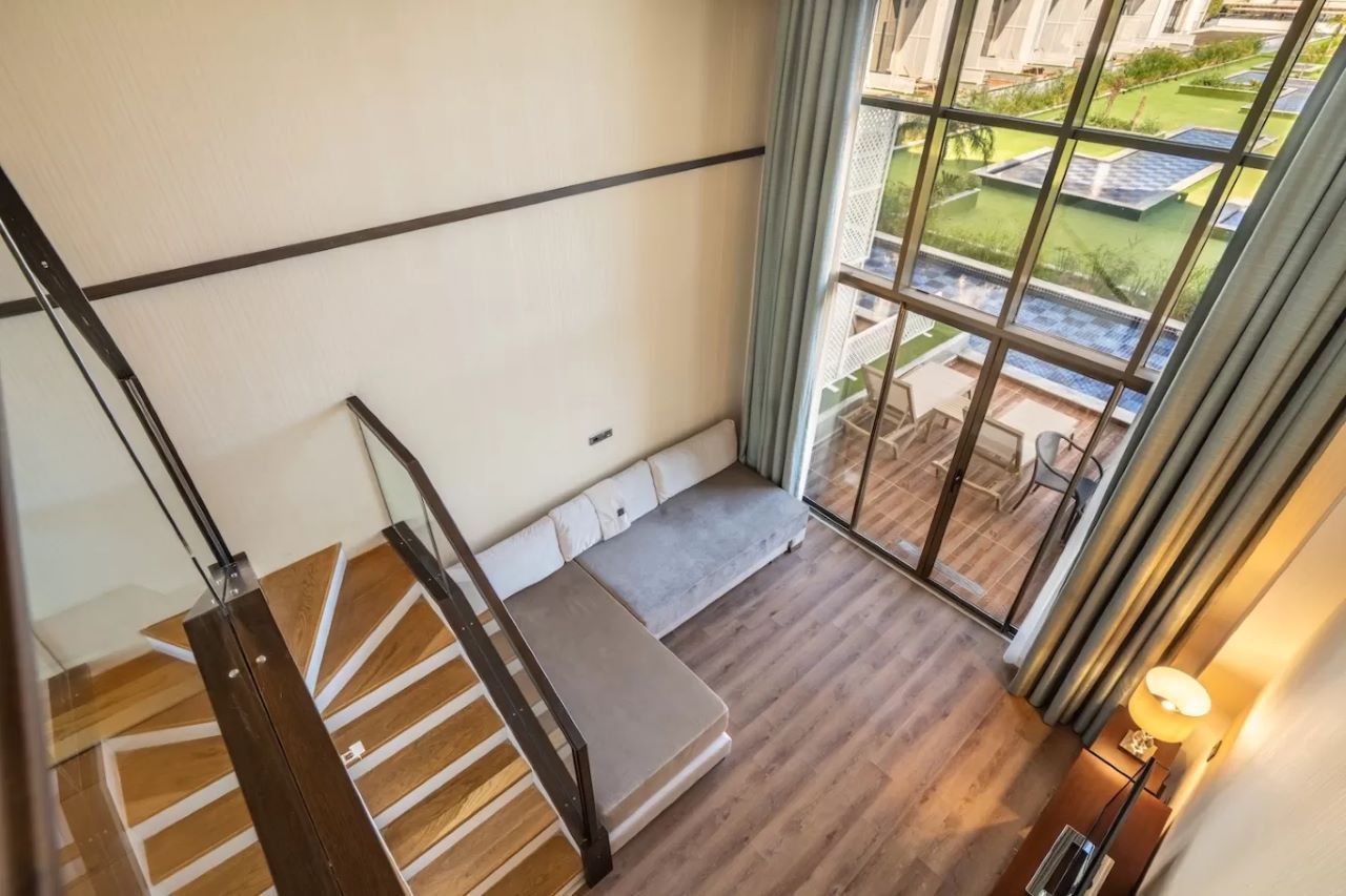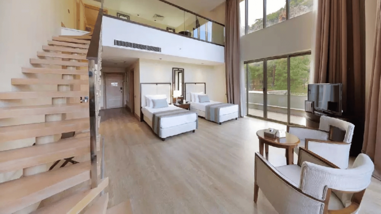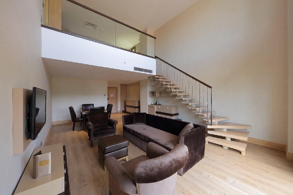 Двохрівневий номер. На першому поверсі вітальня та спальня, на другому поверсі 2 спальні.