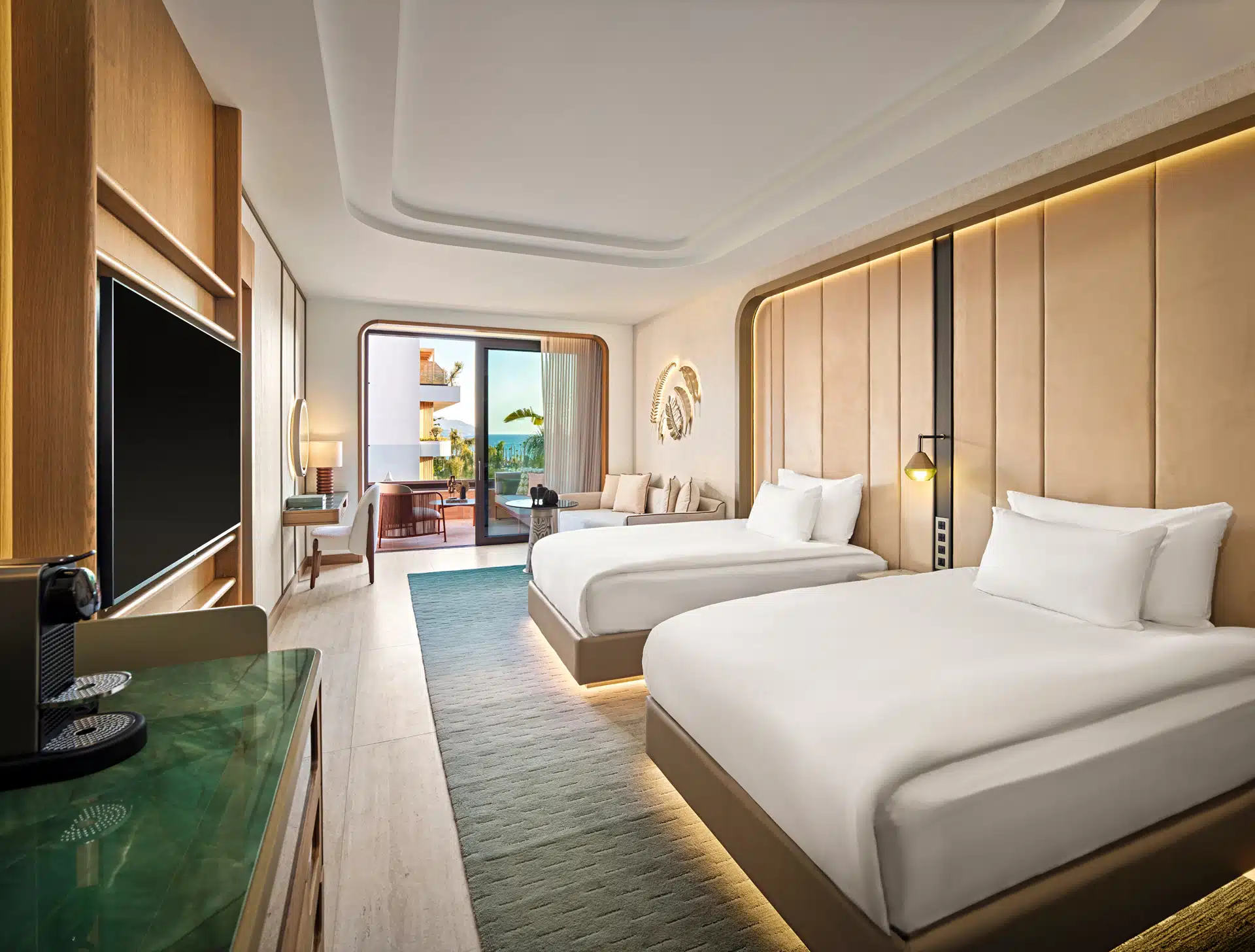 Тримісний комфортний номер XO Cape Arnna пропонує площу 55-60 м², просторий балкон і приватний міні-сад для спокійного відпочинку. Його сучасний дизайн, тепла атмосфера та затишні ліжка забезпечують комфортне перебування, роблячи вашу відпустку ще більш особливою.
