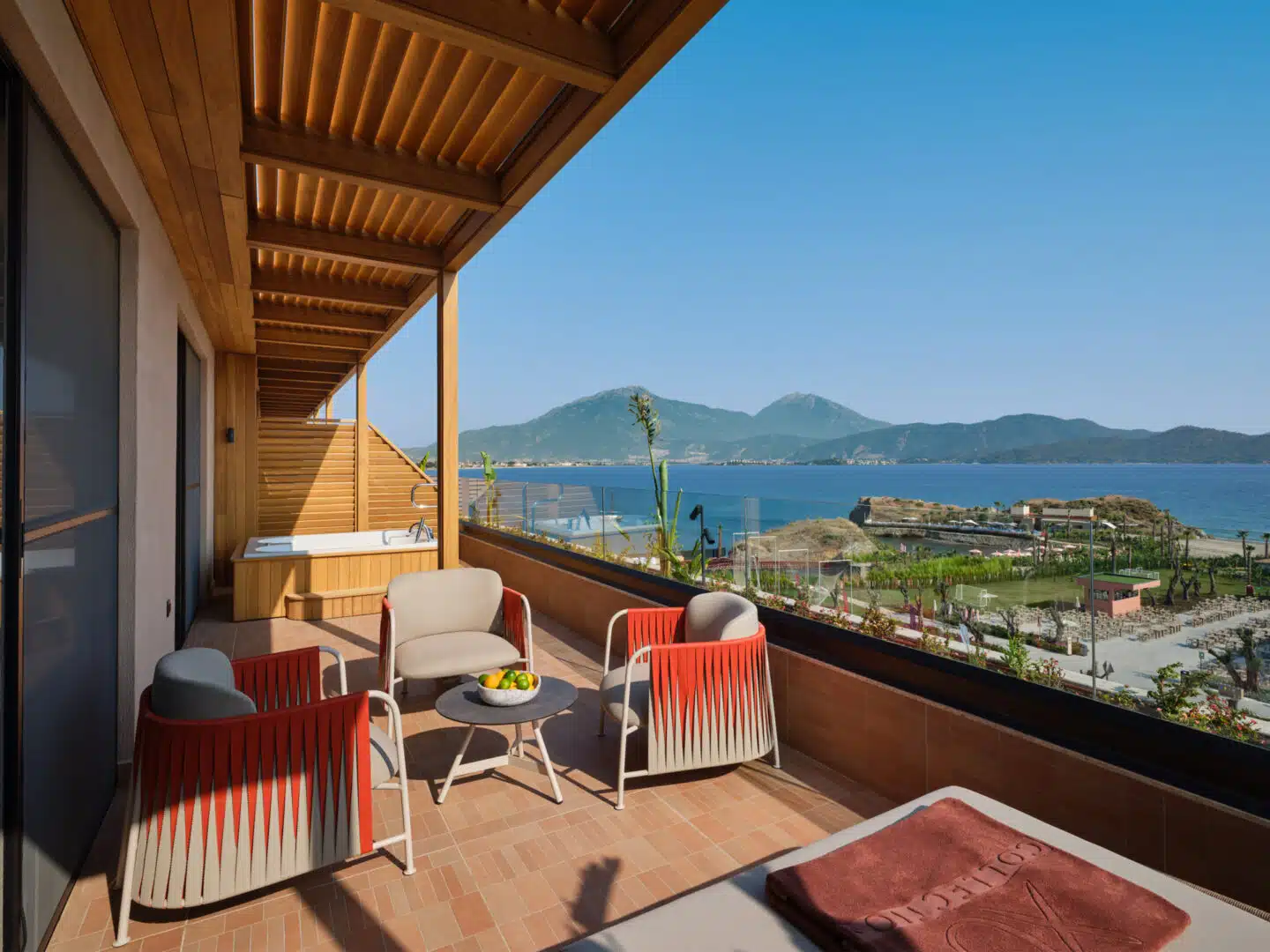 Номер XO Cape Arna Deluxe виходить за рамки стандартних умов проживання завдяки просторому дизайну, світлій вітальні, балкону з видом на море та власному міні-саду, поєднуючи комфорт з природою. Завдяки сучасному дизайну та спокійній атмосфері, він пропонує незабутні враження від відпустки.