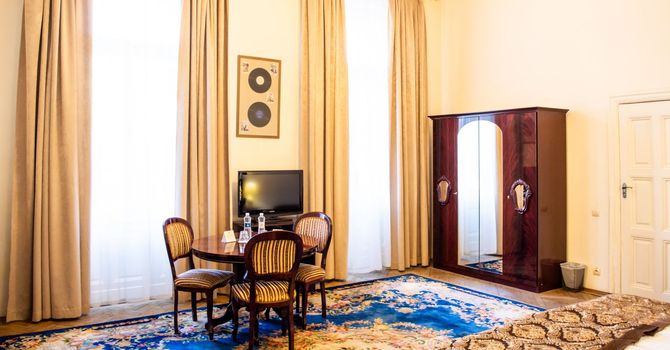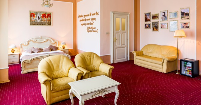 Категорія номерів для справжніх цінителів гармонійного поєднання сучасних вигод та елегантних елементів декору з дотриманням усіх європейських стандартів. Розкішний двокімнатний номер чудово підійде як для ділової людини,так і для подружніх пар. Сучасні італійські меблі, чудова панорама на центральну частину Львова.