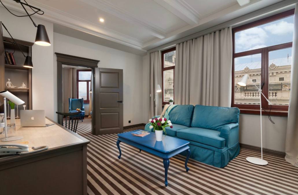Просторий номер із великою зоною відпочинку, вікна якого виходять на центральний проспект міста та неперевершений Львівський Оперний театр.