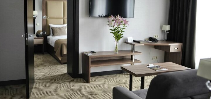 Номер покращеного планування, що складається з передпокою, вітальні та спальні.