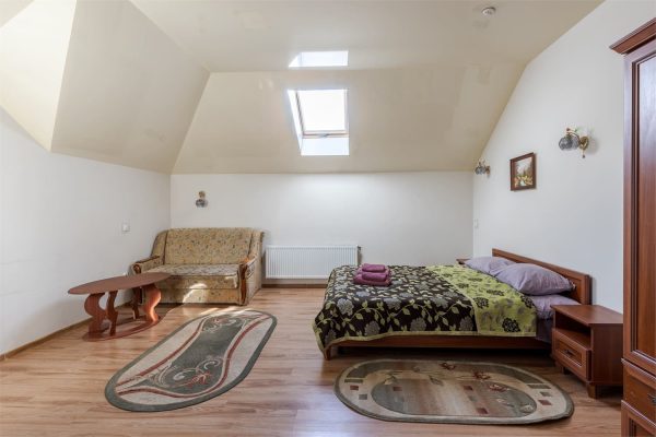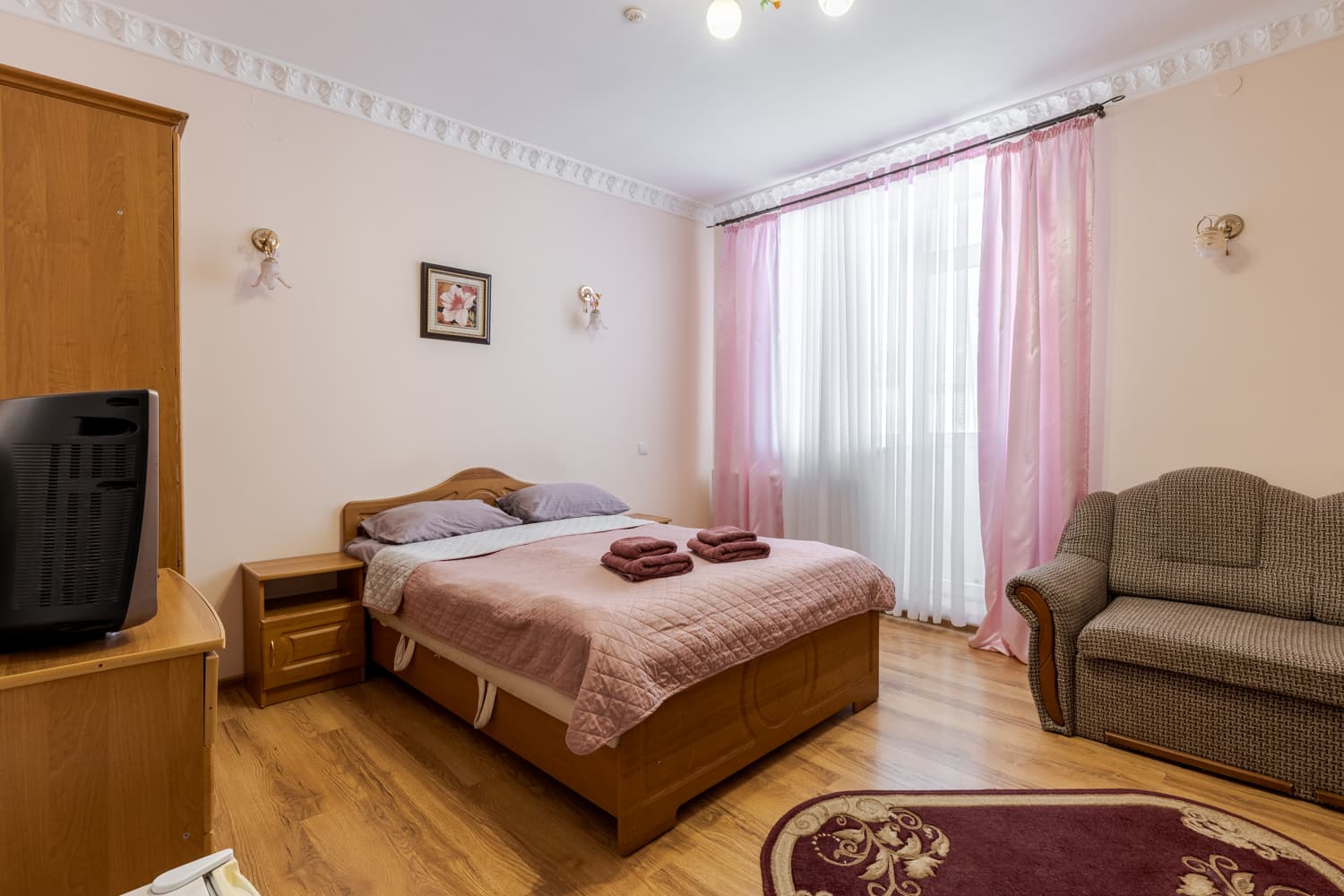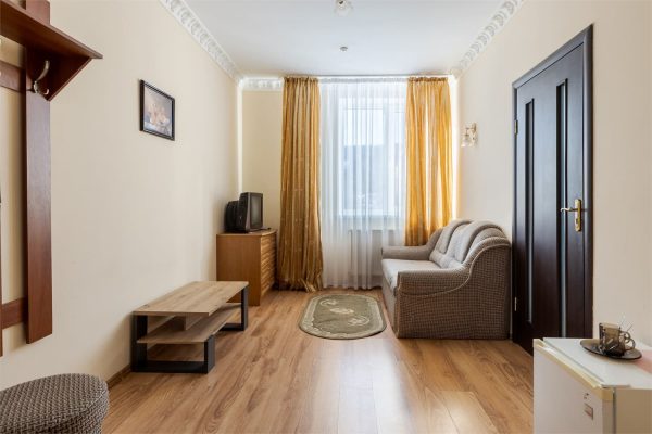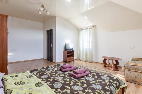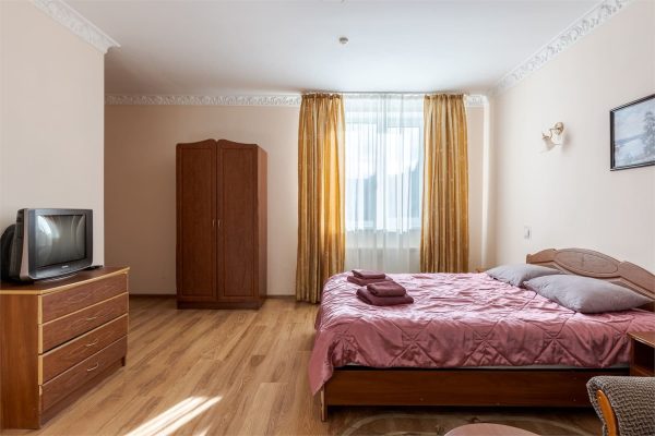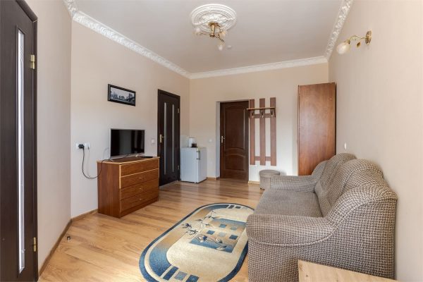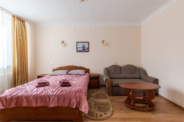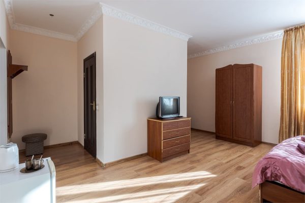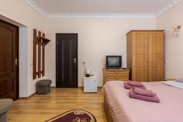 У ньому є двоспальне ліжко, диван (1,40 × 2,05), міні-холодильник, посуд, шафа або комод, вішаки, трюмо, тумбочки, бра та розетки біля ліжка.