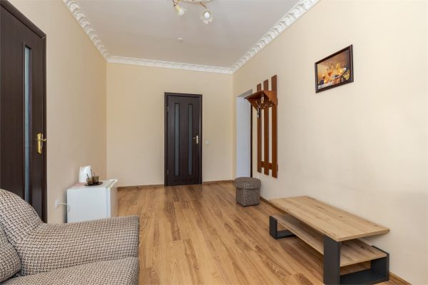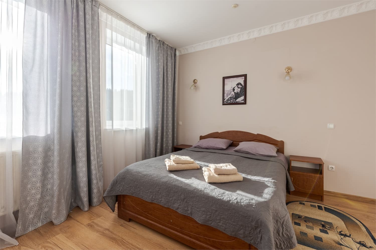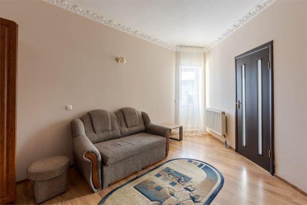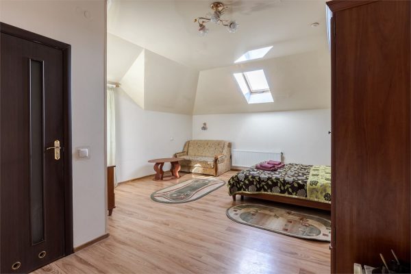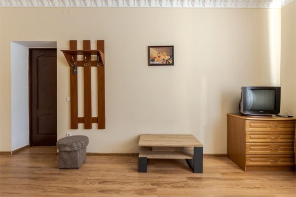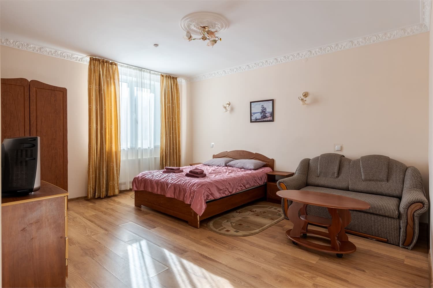 У ньому є двоспальне ліжко, диван (1,40 × 2,05), міні-холодильник, посуд, шафа або комод, вішаки, трюмо, тумбочки, бра та розетки біля ліжка.