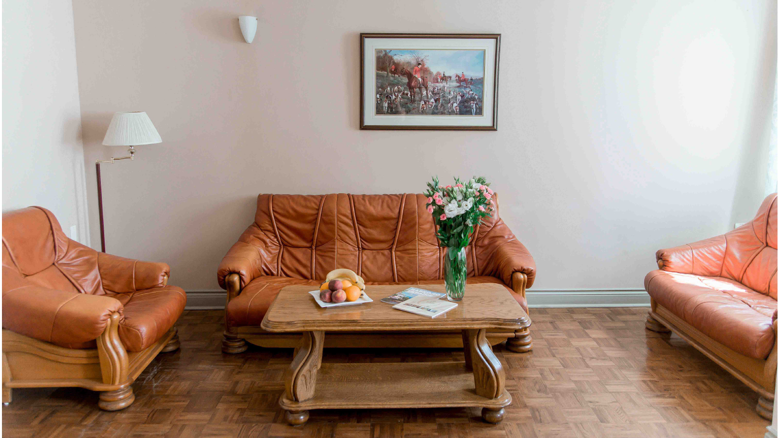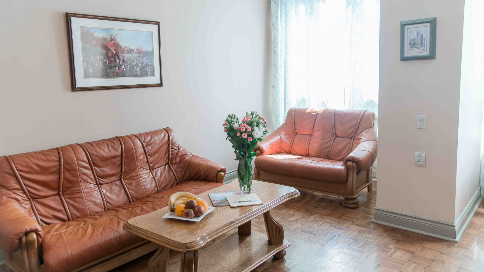 Шкіряний розкладний диван, шафа, крісло, телефон, робочий стіл,