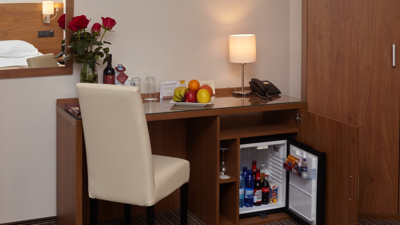Телефон, робочий стіл, тумба під багаж, шафа.