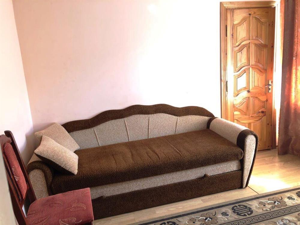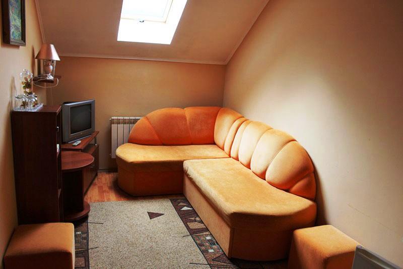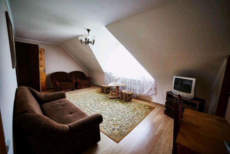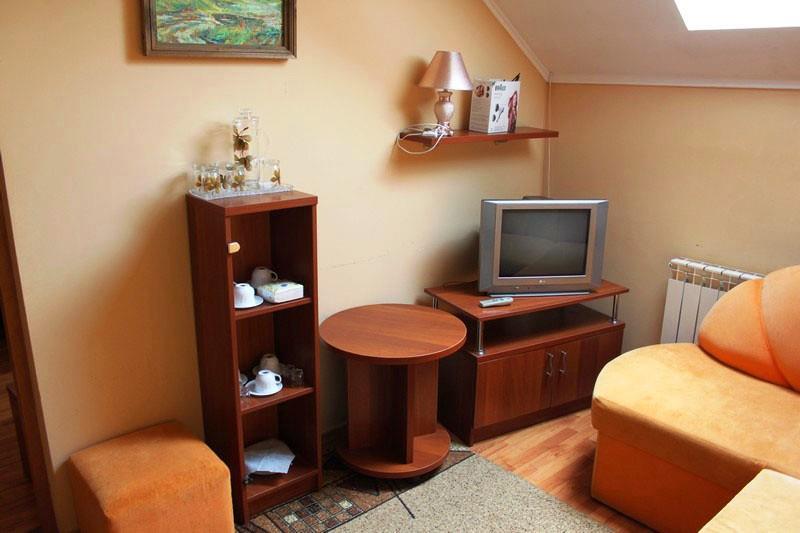 У вітальні — диван (можливе додаткове місце), крісла, журнальний столик, телевізор, холодильник та електрочайник.