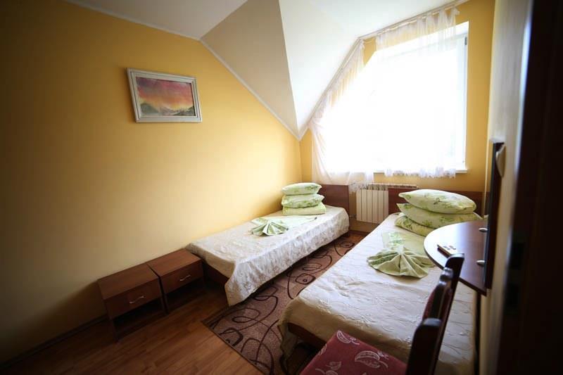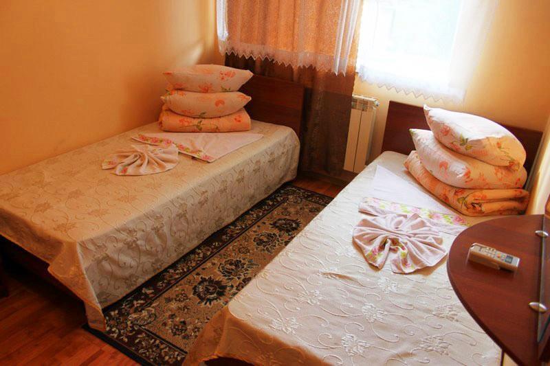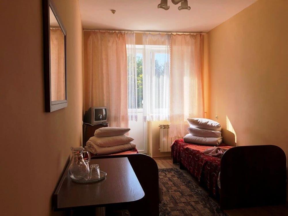 Номери оснащені всім необхідним для проживання: суміщений санвузол із ванною та феном, два односпальні ліжка (зрушені разом), телевізор, холодильник і телефон.