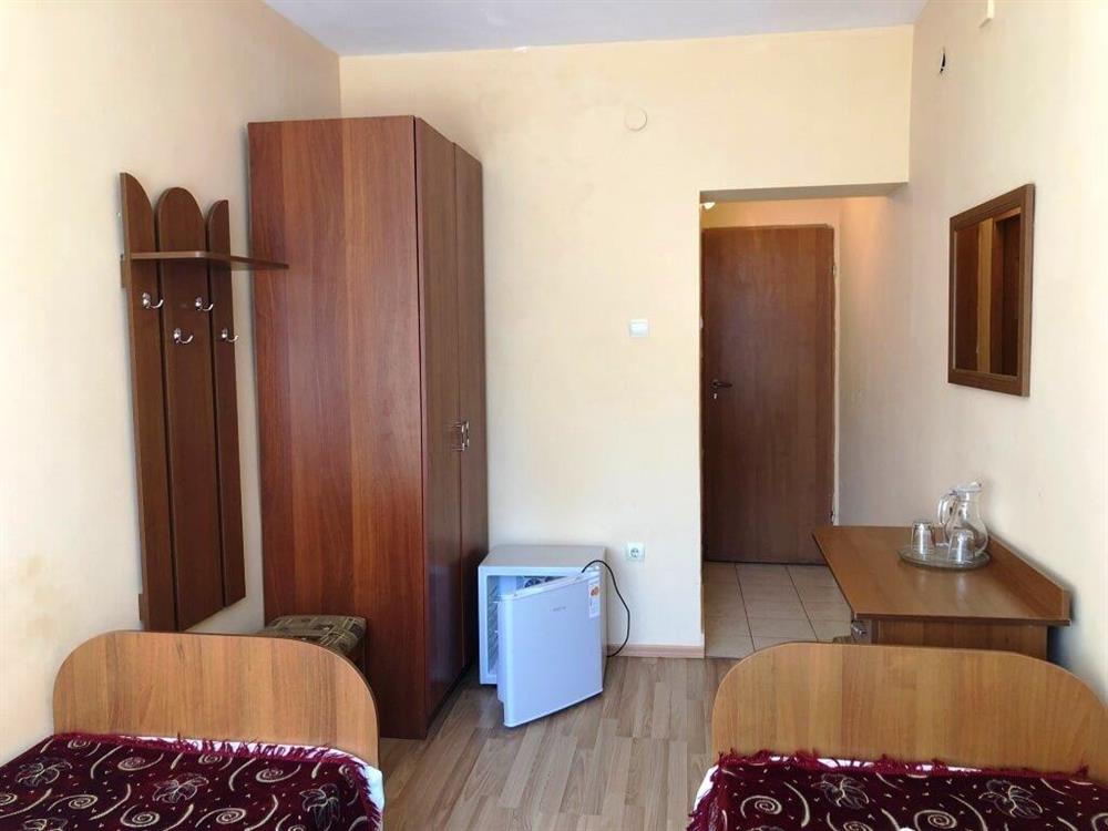 У кімнаті два односпальні ліжка, телевізор, холодильник, стіл зі стільцем, шафа, тумбочка та дзеркало.
