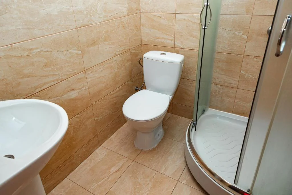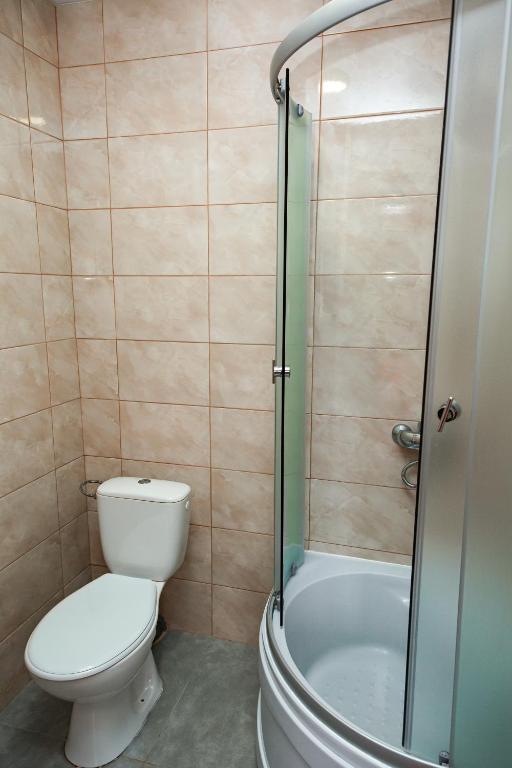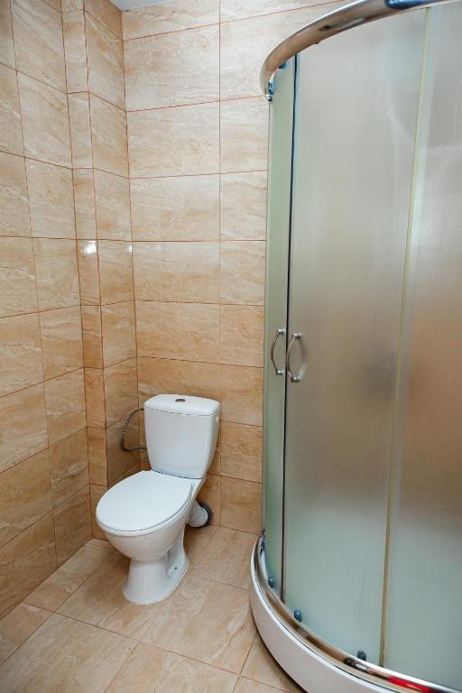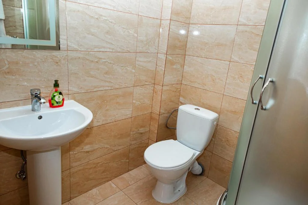 У власній ванній кімнаті: душ, санвузол, рідке мило, туалетний папір і по два рушники на гостя.