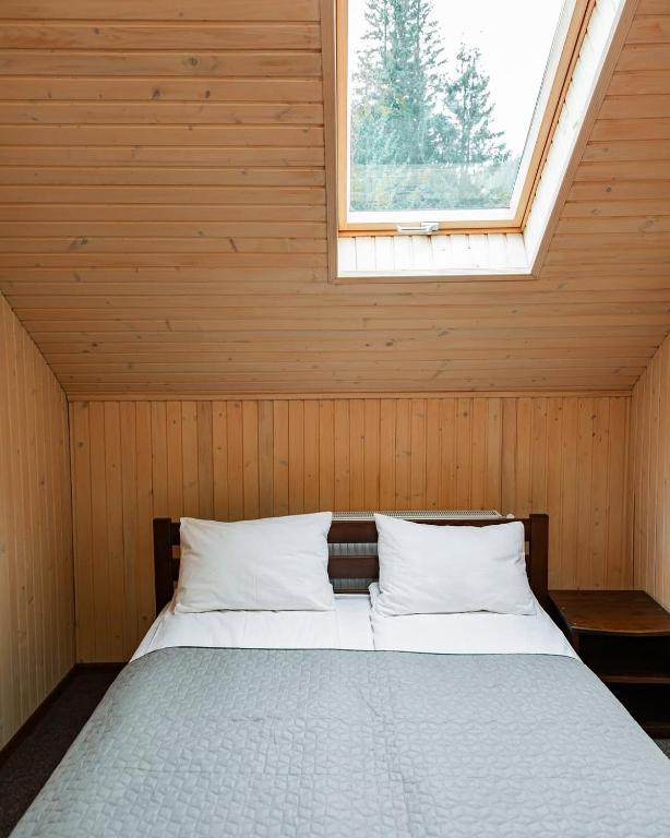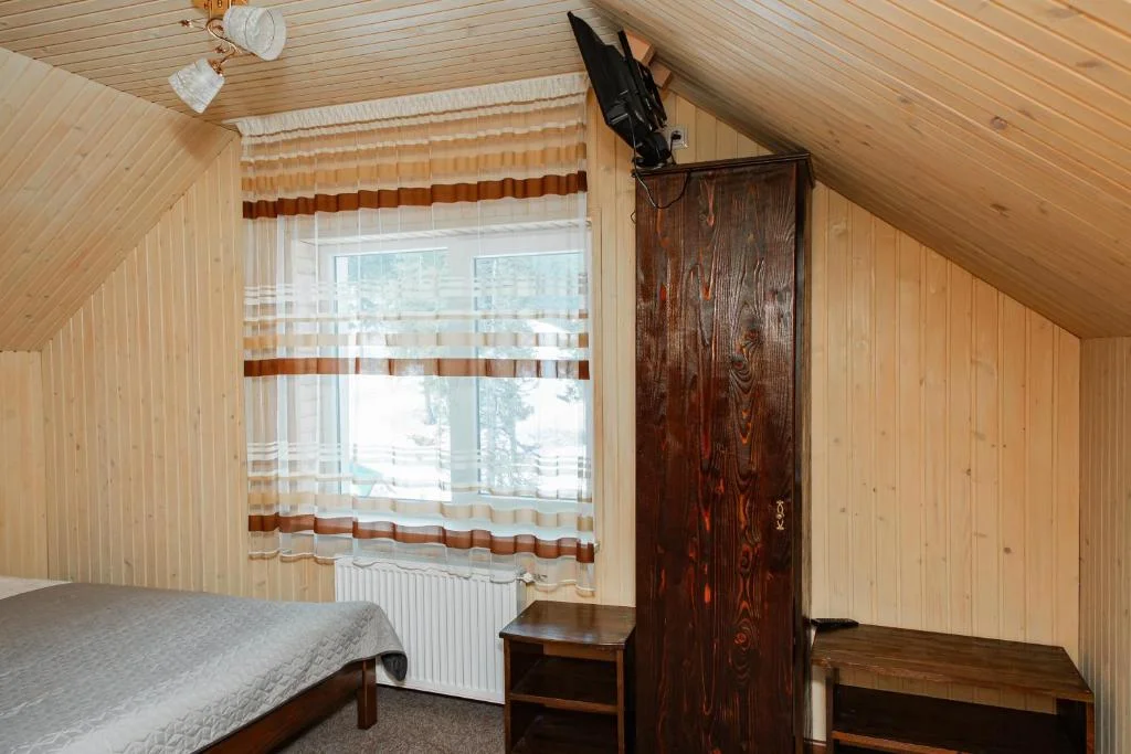 Затишний мансардний номер із видом на ліс і струмок; ліворуч проглядається курорт.