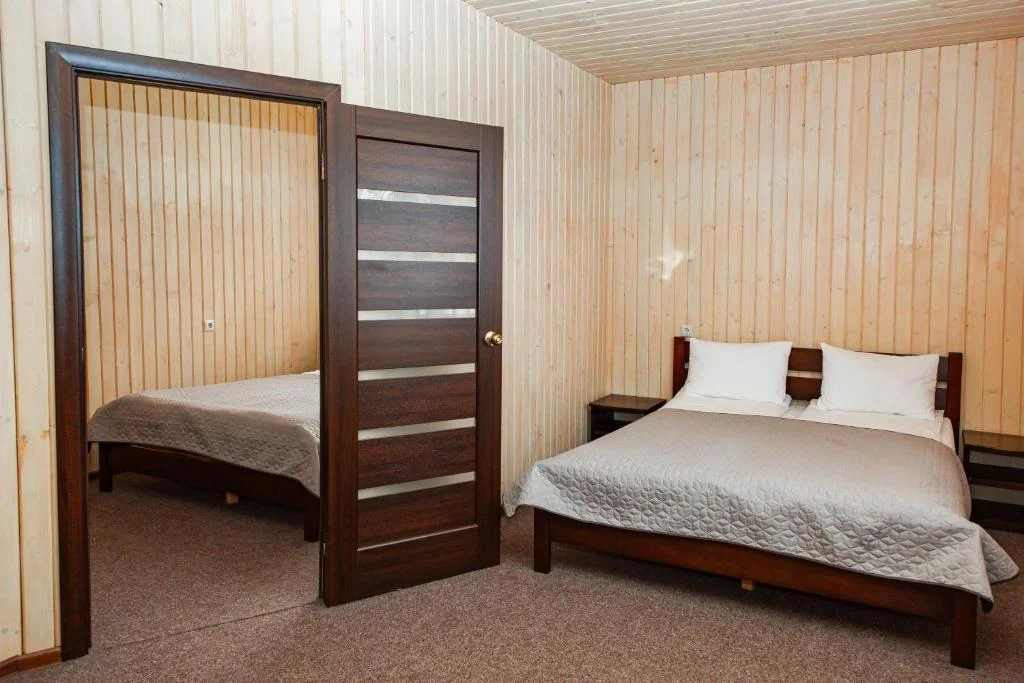 Класичний чотиримісний номер із двома окремими кімнатами: одне двоспальне та два односпальні ліжка забезпечують зручне розміщення для родини чи двох пар.