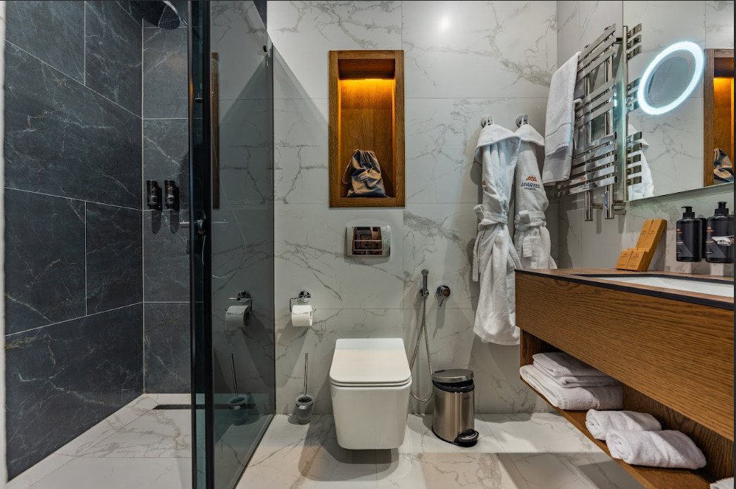 Дві окремі спальні, вітальня та два санвузли з ванною забезпечують максимальну приватність і зручність.