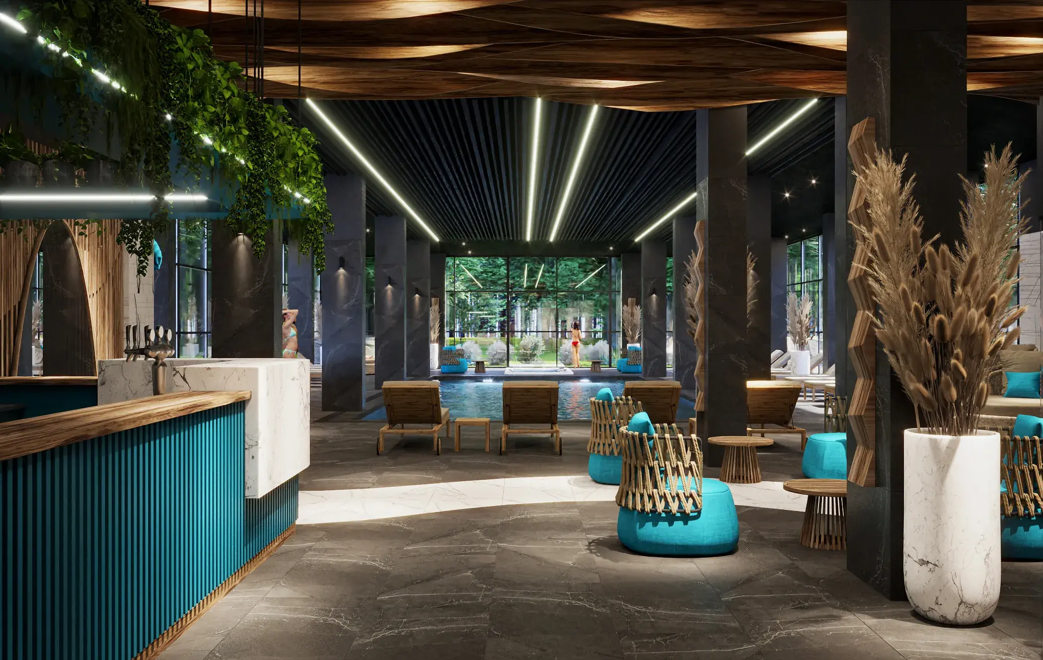 SPA-комплекс включає термальні басейни, чан, тематичні сауни (евкаліптова, трав’яна, римська, хамам, соляна печера, крижана кімната) та зони релаксу для відновлення тіла й душі.
