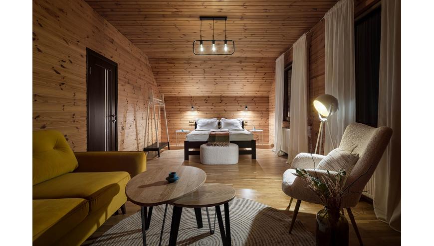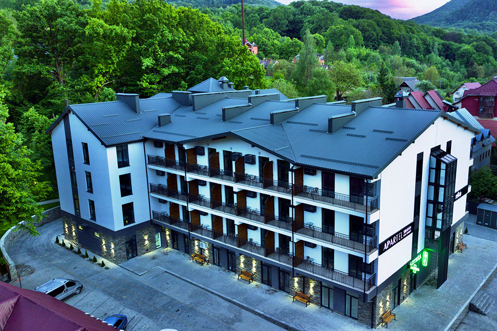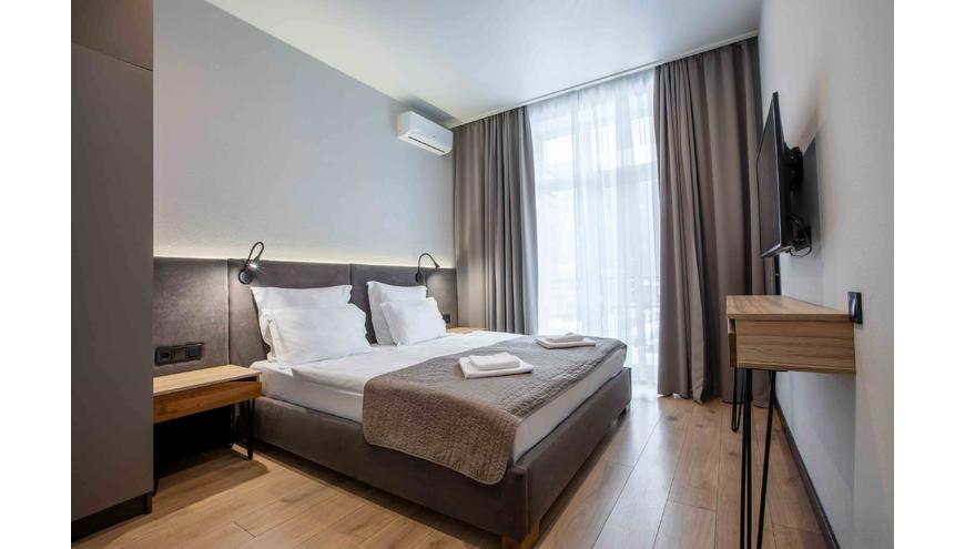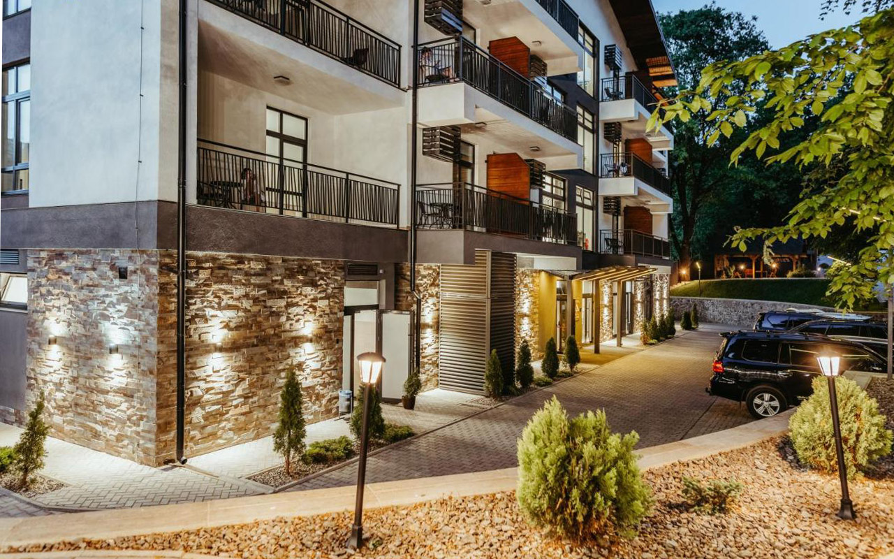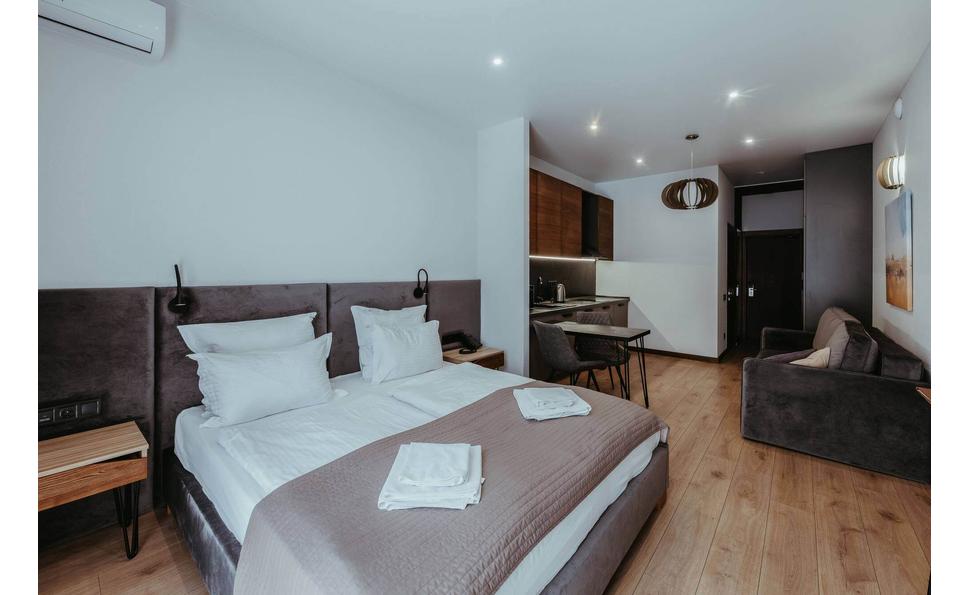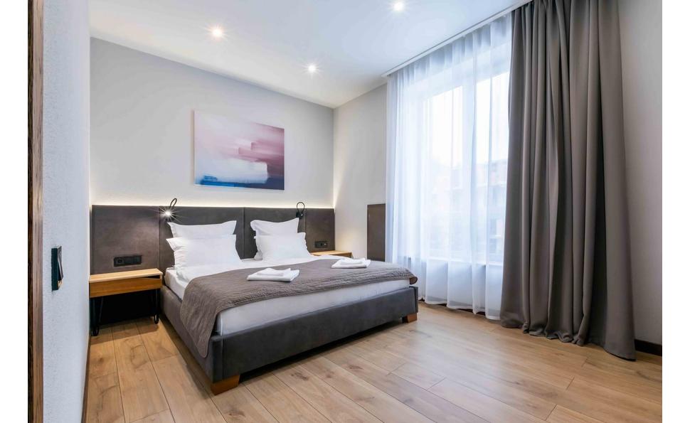 Готельний комплекс складається з 60-ти просторих апартаментів зі зручним, продуманим плануванням, створених з урахуванням будь-яких потреб гостей, з використанням вишуканого авторського дизайну, кращих екологічних матеріалів, якісних меблів, сучасної техніки та комплектуючих відомих світових виробників.