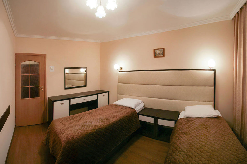 The hotel is designed for simultaneous accommodation of up to 500 people - these are 90 single and 140 double rooms, as well as 50 one-room "semi-suites" and 9 two-room "luxury" rooms. The hotel's infrastructure includes a diet canteen, a sauna with a swimming pool, a beauty salon, a hairdresser, doctors' offices, and massage rooms.